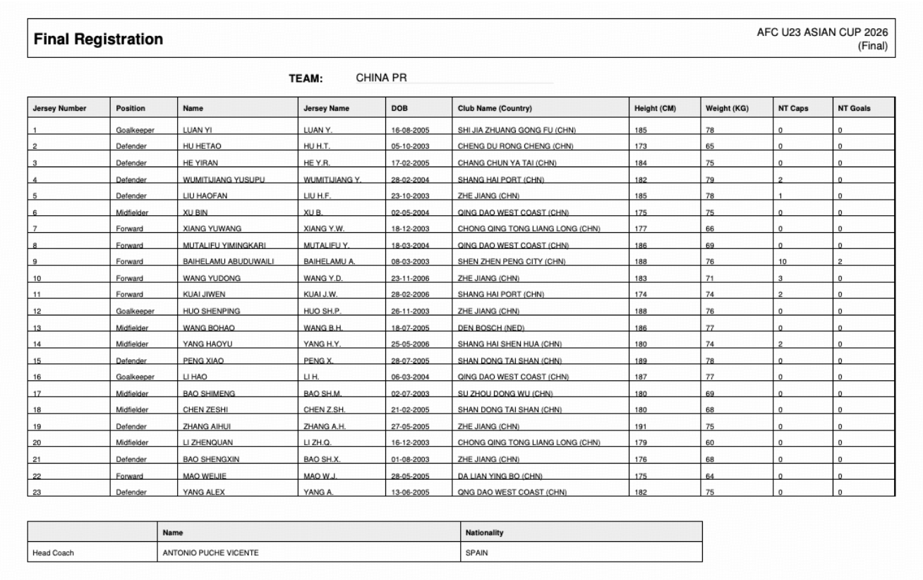 เมื่อวันที่ 4 มกราคม ตามเวลาปักกิ่ง ทีมฟุตบอลทีมชาติจีนชุดชิงแชมป์เอเชียรุ่นอายุไม่เกิน 23 ปี ได้ประกาศรายชื่อนักเตะอย่างเป็นทางการผ่านทางเว็บไซต์ของเอเอฟซี โดยมีหวัง หยูตง เป็นกัปตันทีม ร่วมกับนักเตะอย่างไป่ เฮลาหมู และกัว จีเหวิน ขณะที่ปีใหม่เริ่มต้นขึ้น นักเตะทีมชาติหนุ่มคนหนึ่งได้พลาดการคัดเลือกติดต่อกัน ทำให้เขาต้องเผชิญกับความท้าทายในอาชีพการเป็นนักฟุตบอลระดับนานาชาติพลาดโอกาสในศึกเอเชียนคัพ U23! ดาวรุ่งวัย 19 ปีของจีนตกเป็นตัวสำรอง: ถูก Shao Jiayi และ Antonio ตัดออกจากทีม