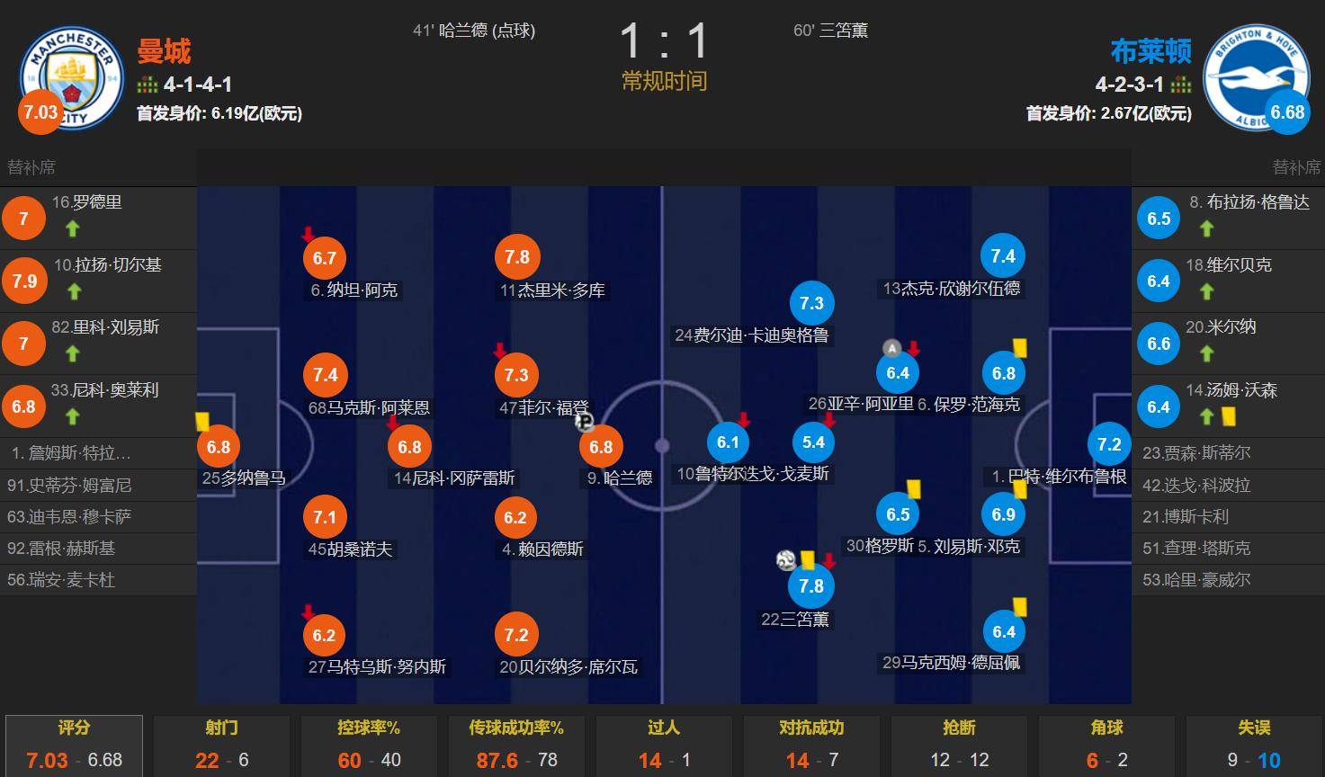 ตลอดการแข่งขันแมนเชสเตอร์ ซิตี้ครองบอลได้ 60% ยิงทั้งหมด 22 ครั้งเข้ากรอบ 6 ครั้ง ขณะที่ไบรท์ตันยิงได้ 6 ครั้งเข้ากรอบ 3 ครั้งการเสียคะแนนของซิตี้เกิดจากผลงานที่ไม่สม่ำเสมอของฮาแลนด์และการขาดผู้เล่นที่ทำประตูได้เป็นอันดับสองที่น่าเชื่อถือ การเสมอเป็นนัดที่สามติดต่อกันนี้อาจทำให้แมนเชสเตอร์ ซิตี้หลุดจากเส้นทางลุ้นแชมป์ได้