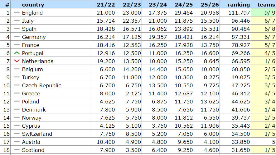 โดยเฉพาะอย่างยิ่ง พรีเมียร์ลีกอยู่ในอันดับต้นของตารางคะแนนด้วยค่าเฉลี่ย 20.958 คะแนน ตามมาอย่างใกล้ชิดโดย พรีเมียรา ลีกา ของโปรตุเกส ที่ 16.6 คะแนน บุนเดสลีกา อยู่ในอันดับสามด้วย 16.214 คะแนน ขณะที่ ลาลีกา ตามมาเป็นอันดับสี่ด้วยเพียง 15.531 คะแนนเซเรีย อา อยู่ในอันดับที่ห้าด้วยคะแนน 15.500 คะแนน ขณะที่ลีกเอิง อยู่ในอันดับที่หกด้วยคะแนน 13.750 คะแนน หากลาลีกาไม่สามารถปรับปรุงผลงานได้อย่างรวดเร็วในนัดต่อไป อาจเสี่ยงที่จะถูกแซงหน้าโดยเซเรีย อา, พรีเมียรา ลีกา หรือแม้กระทั่งลีกเอิง ซึ่งอาจทำให้ตกไปอยู่ในอันดับที่ห้าหรือต่ำกว่านั้นได้ ซึ่งจะทำให้จำนวนตัวแทนในยูฟ่า แชมเปียนส์ลีก ลดลงจากสี่ทีมเป็นสามทีม