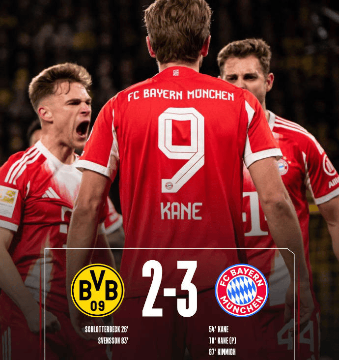 การกลับมาอย่างน่าทึ่ง: บาเยิร์น 3-2 ดอร์ทมุนด์ เคนทำสองประตู + คิมมิชยิงชัยชนะคว้าแชมป์ล่วงหน้า ล็อตเตเบ็คโชว์ฝีมือการป้องกันระดับมาสเตอร์ในบุนเดสลีกา
