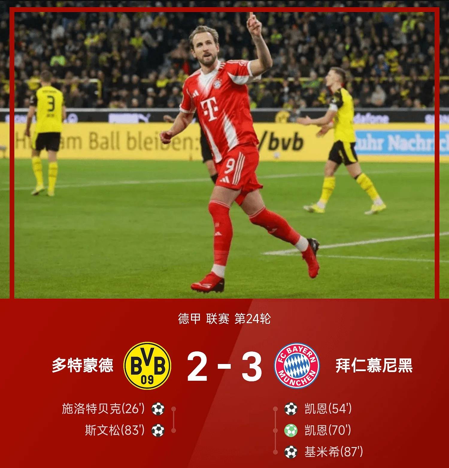 เมื่อวันที่ 1 มีนาคม ในรอบที่ 24 ของบุนเดสลีกา บาเยิร์น มิวนิค พลิกกลับมาเอาชนะ โบรุสเซีย ดอร์ทมุนด์ 3-2, ไบเออร์ เลเวอร์คูเซน เสมอกับ ไมนซ์ 05 1-1, แฮร์ธ่า เบอร์ลิน เอาชนะ ยูเนียน เบอร์ลิน 1-0, ฮอฟเฟ่นไฮม์ แพ้ให้กับ เซนต์ เพาลี 0-1 และ เวเดอร์ เบรเมน เอาชนะ ฮอฟเฟ่นไฮม์ 1-0 ตารางคะแนนบุนเดสลีกาปัจจุบันแสดงให้เห็นว่า บาเยิร์น มิวนิค นำเป็นจ่าฝูงด้วย 63 คะแนน นำหน้าอันดับสองอยู่ 11 คะแนนโบรุสเซีย ดอร์ทมุนด์ อยู่ในอันดับสองด้วยคะแนน 52 คะแนน ตามมาด้วยฮอฟเฟ่นไฮม์ในอันดับสามด้วยคะแนน 46 คะแนน สตุ๊ตการ์ทอยู่ในอันดับสี่ด้วยคะแนน 43 คะแนน ไลป์ซิกอยู่ในอันดับห้าด้วยคะแนน 41 คะแนน และไบเออร์ เลเวอร์คูเซ่นอยู่ในอันดับห้าด้วยคะแนน 40 คะแนน