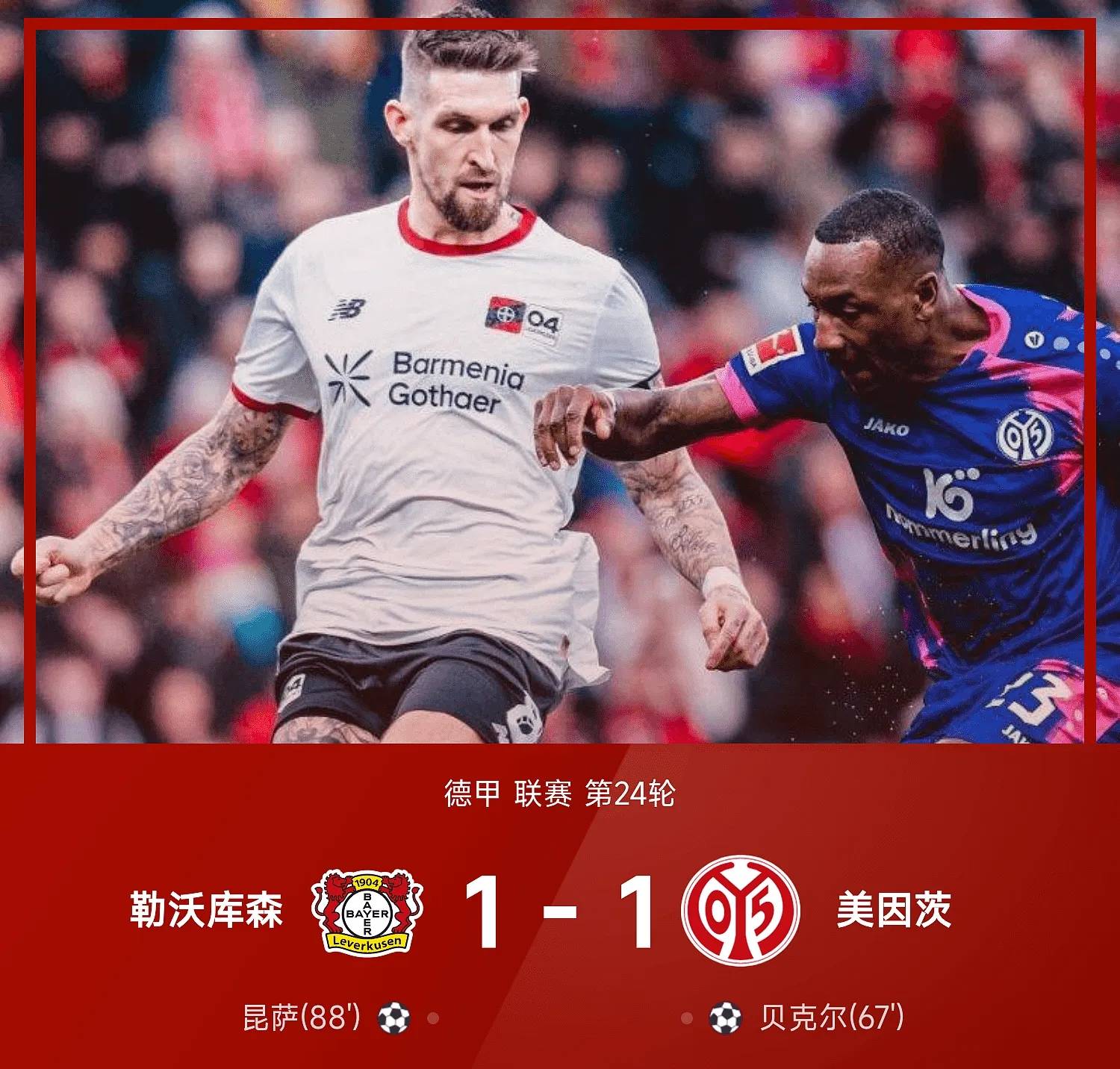 บุนเดสลีกา นัดที่ 24 ฤดูกาล 2025/26: ไบเออร์ เลเวอร์คูเซ่น เปิดบ้านรับการมาเยือนของ ไมนซ์ ในครึ่งแรก นาทีที่ 44 กุนเด้ได้จุดโทษในกรอบเขตโทษ แต่ผู้ตัดสินได้ตรวจสอบ VAR และตัดสินว่า กริมัลโด้อยู่ในตำแหน่งล้ำหน้า จึงยกเลิกจุดโทษ หลังจากพักครึ่ง ในนาทีที่ 67 เนเบอร์ได้วิ่งทะลุขึ้นมาและเปิดบอลเข้ากลางให้ เบคเกอร์ วอลเลย์จากขอบเขตโทษเข้าไป ทำให้ทีมเจ้าบ้านขึ้นนำในช่วงเวลาสุดท้ายของเกม โคฟาเน่ส่งบอลข้ามอย่างแม่นยำในนาทีที่ 88 ทำให้คูนาสสามารถยิงเข้าไปและตีเสมอได้อย่างน่าตื่นเต้น ไบเออร์ เลเวอร์คูเซ่นจบเกมด้วยการเสมอ 1-1 กับไมนซ์