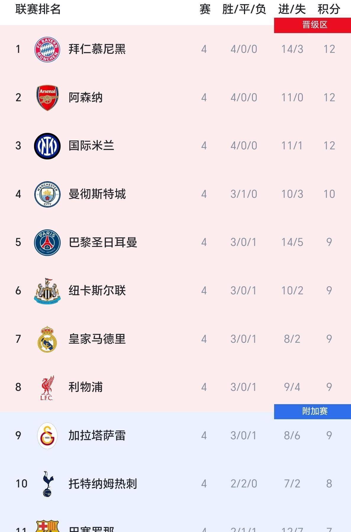 บาเยิร์น มิวนิค ครองตำแหน่งจ่าฝูงของตารางในตอนนี้ ด้วยพลังโจมตีที่น่าเกรงขามของพวกเขา โดยทำประตูได้ถึง 14 ประตู ซึ่งแสดงให้เห็นถึงพลังโจมตีที่น่ากลัวของพวกเขา อาร์เซนอล ในขณะเดียวกัน ยังคงเป็นทีมเดียวในแชมเปียนส์ลีกที่ยังไม่เสียประตูเลย โดยมีแนวรับที่แข็งแกร่งเหมือนหินผา