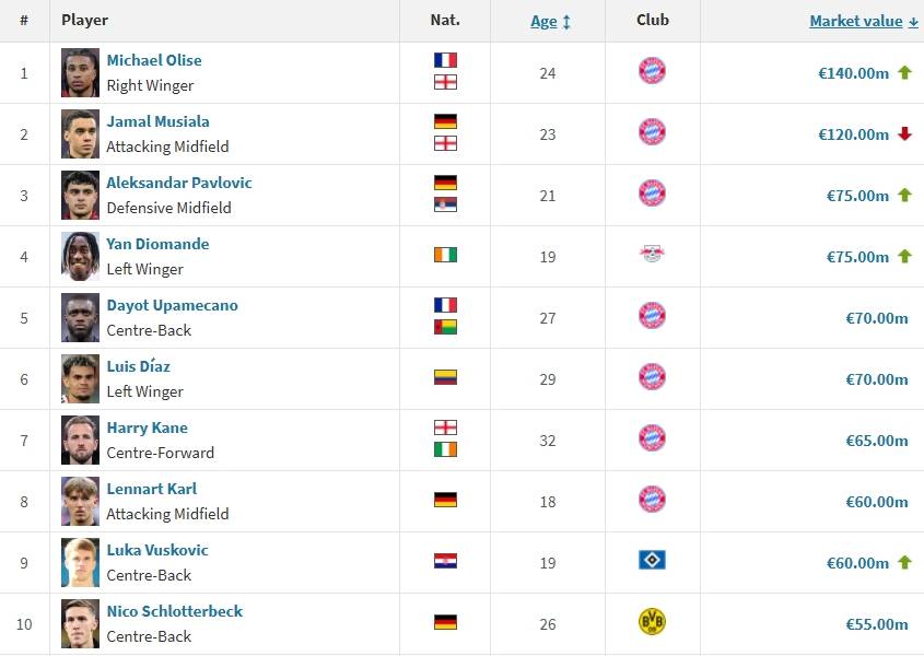 เดนมาร์ก อัพเดทมูลค่านักเตะบุนเดสลีกา 20 มีนาคมนี้ บุนเดสลีกาที่สอง "Mr. Yiou" Olisser และ Musiara มีหนึ่งลิตรและอีกหนึ่งลิตร Orisse เพิ่มขึ้น 10 ล้านยูโรและ Musiala ลดลง 10 ล้านยูโร ทั้งสองได้เปิดบุนเดสลีกาแรกก่อน และตอนนี้พวกเขาได้เปิดช่องว่าง 20 ล้านยูโรแล้ว