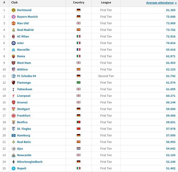 สถิติการเข้าชมการแข่งขันในบ้านเฉลี่ยสูงสุด 25 อันดับแรกของโลกในฤดูกาลนี้จาก Transfermarkt: ดอร์ทมุนด์และบาเยิร์น มิวนิคครองสองอันดับแรก อินเตอร์ มิลานอยู่อันดับที่ 19