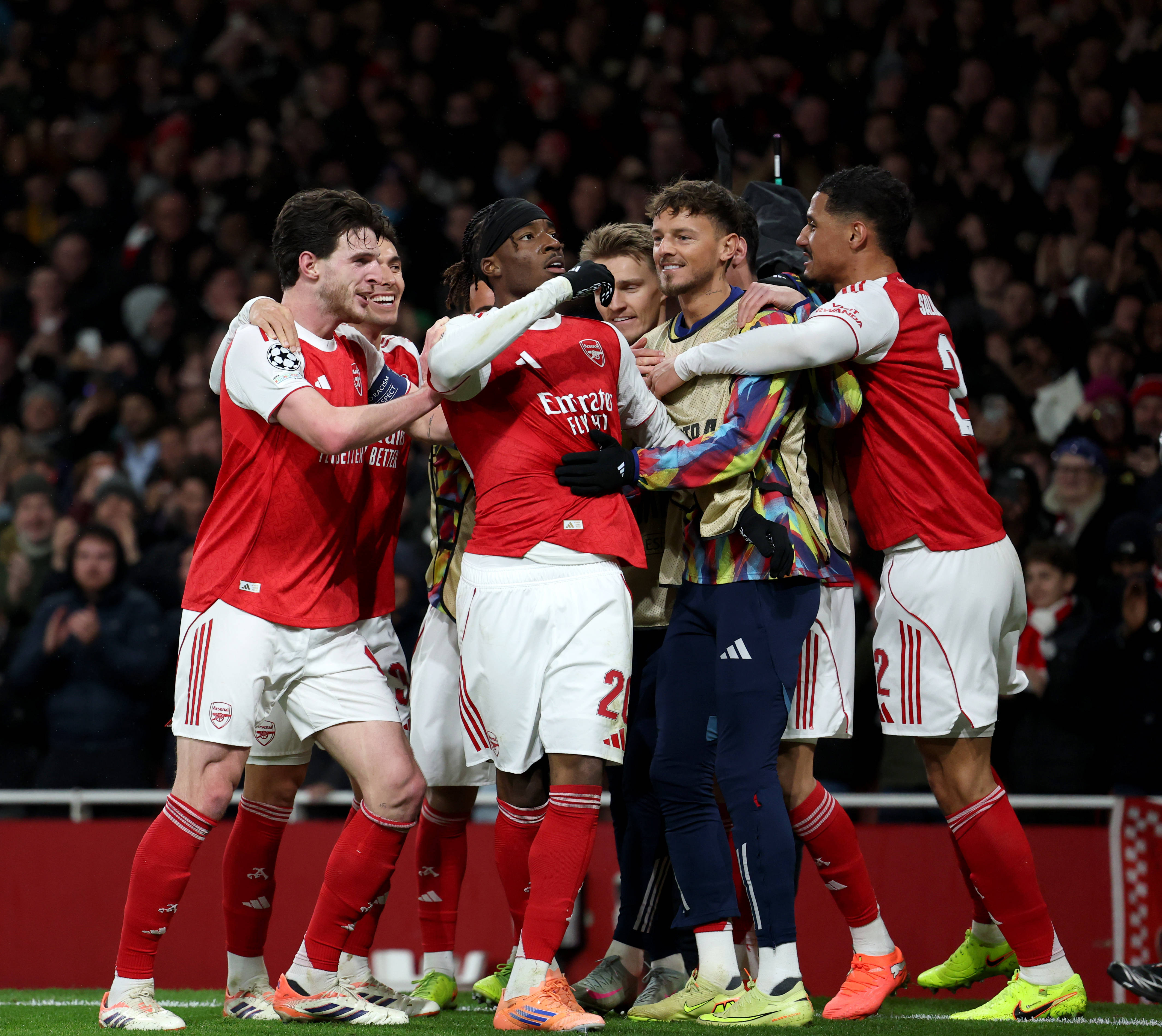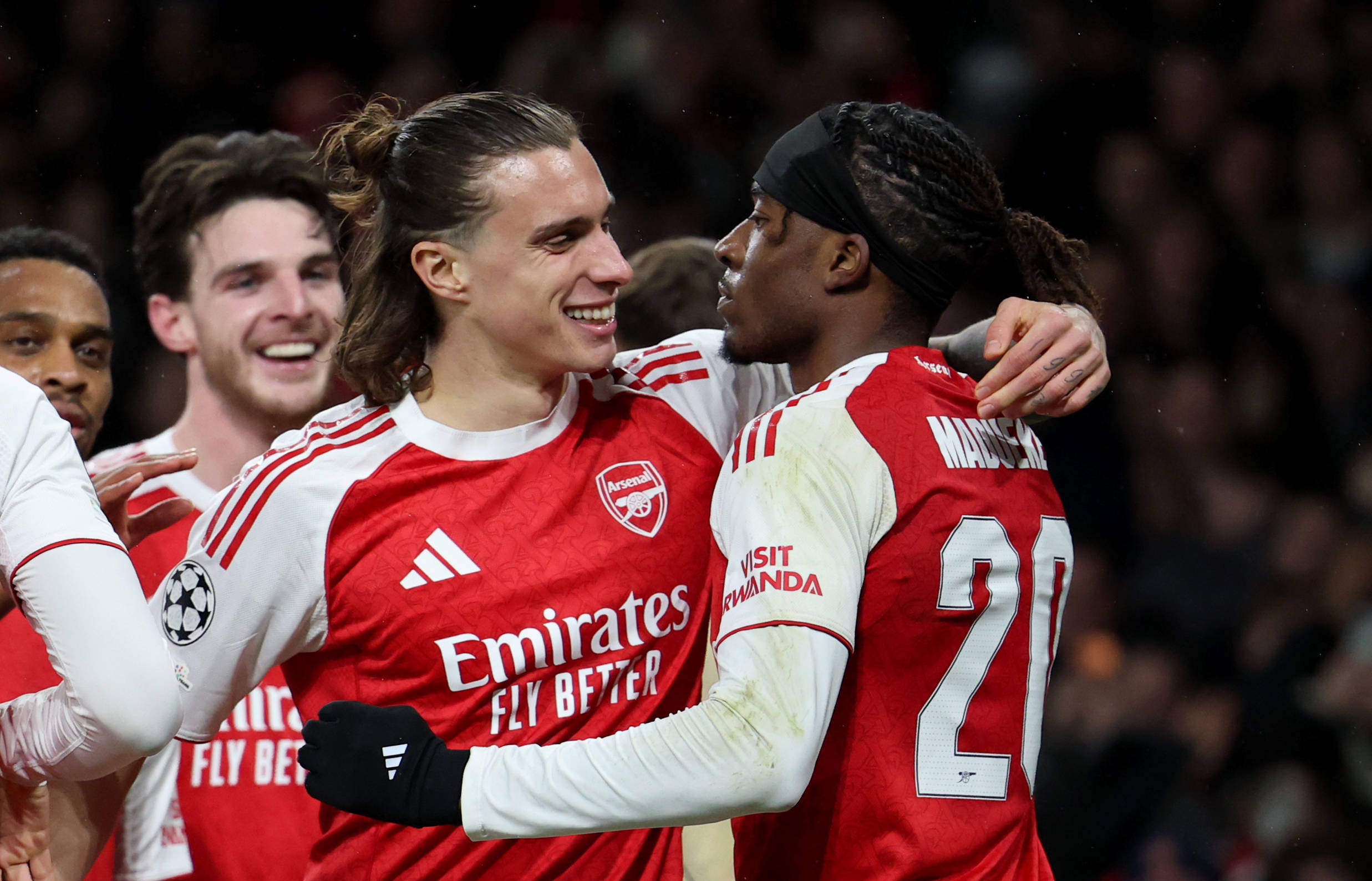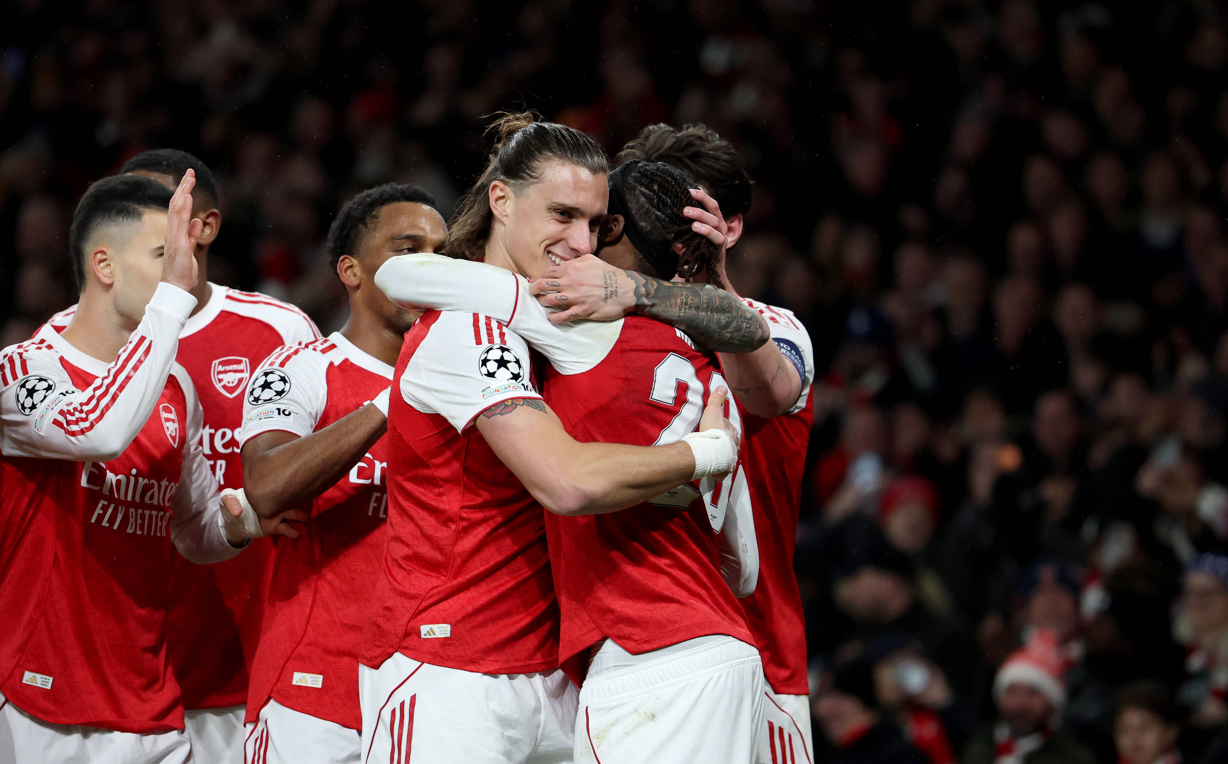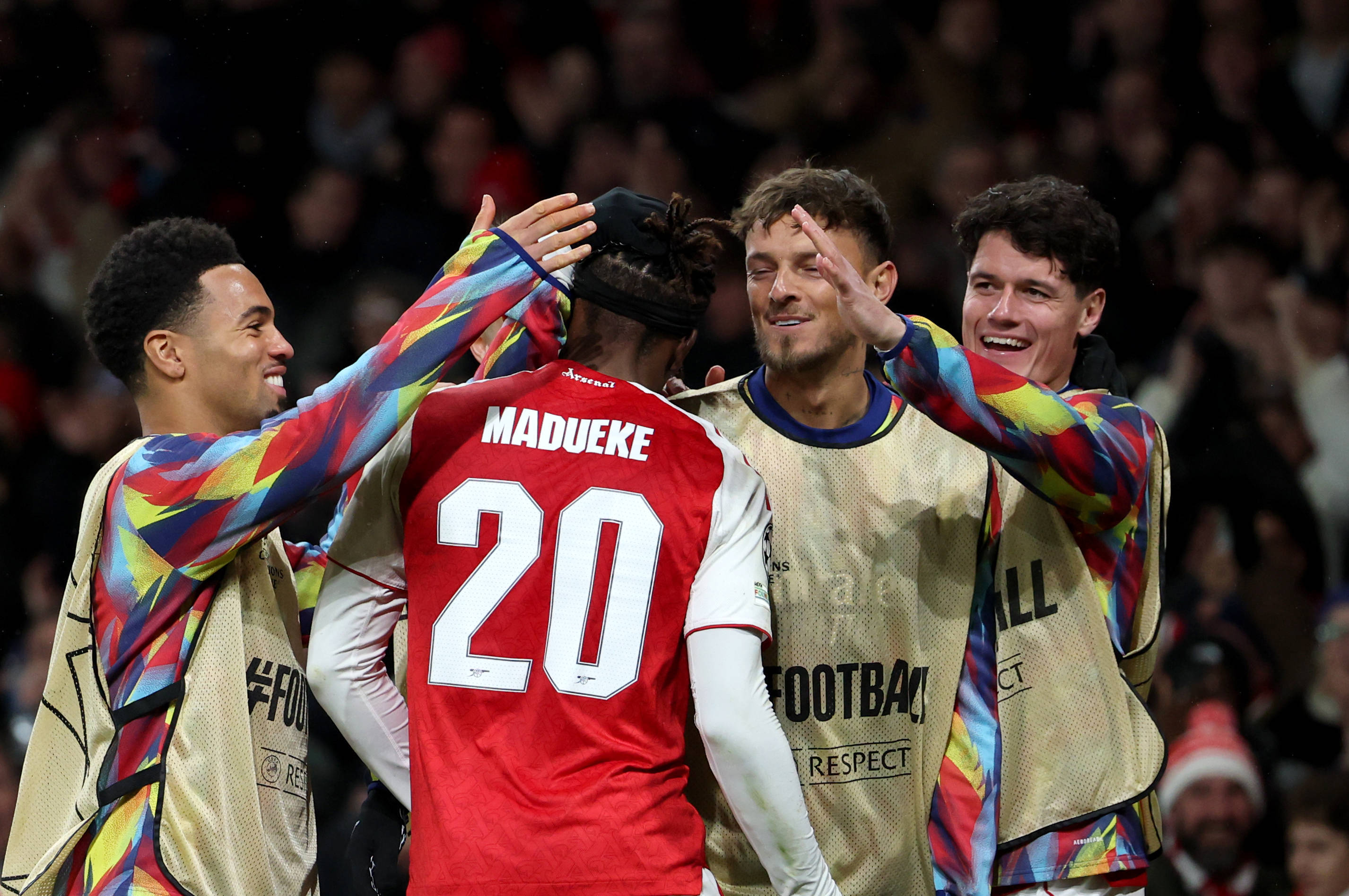 เมื่อวันที่ 26 พฤศจิกายน กาเบรียล มาร์ติเนลลี นักเตะอาร์เซนอล (คนที่สองจากขวา) ฉลองกับเพื่อนร่วมทีมหลังจากทำประตูได้ ภาพโดย หลี่ หยิง สำนักข่าวซินหัว