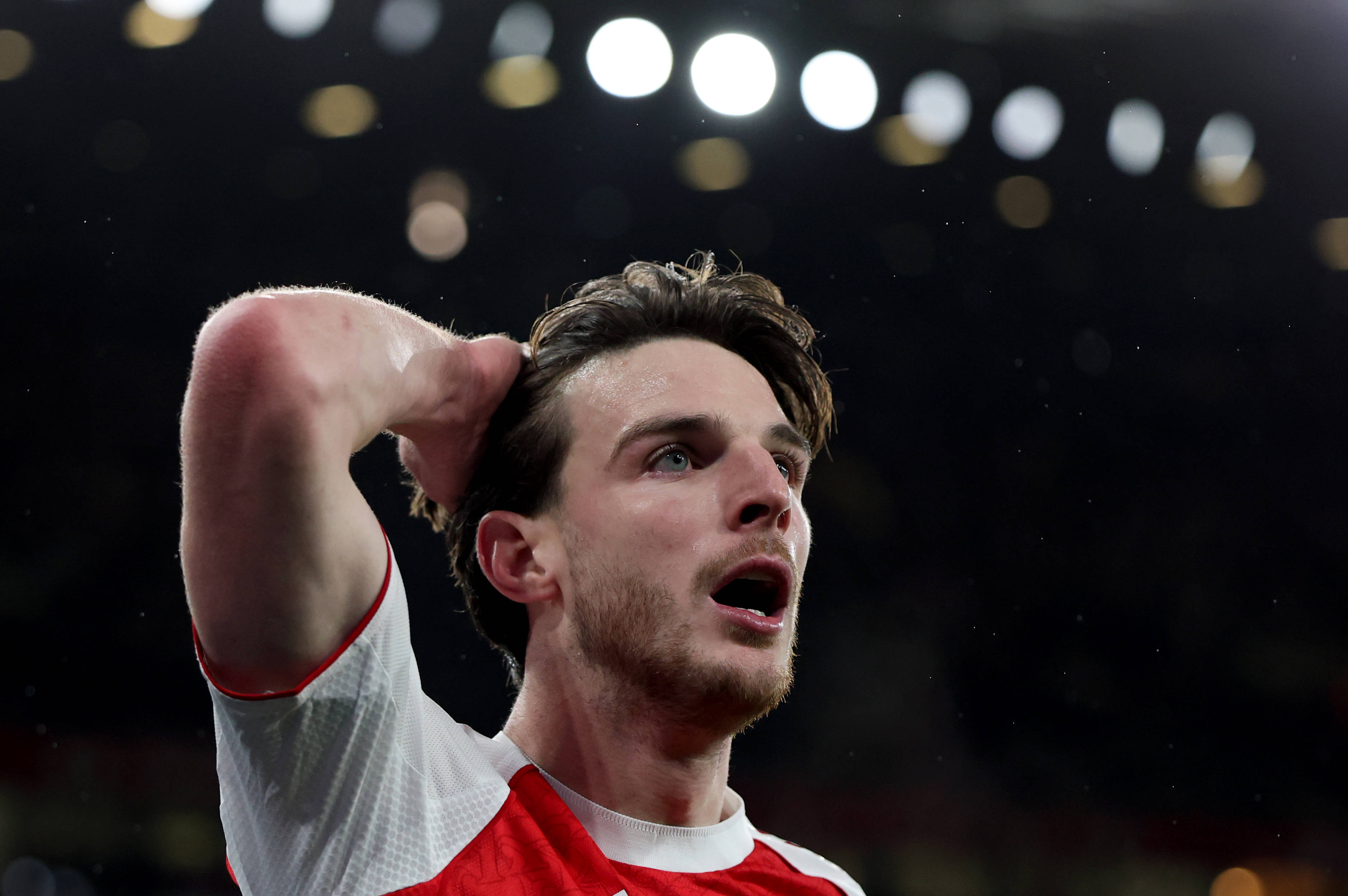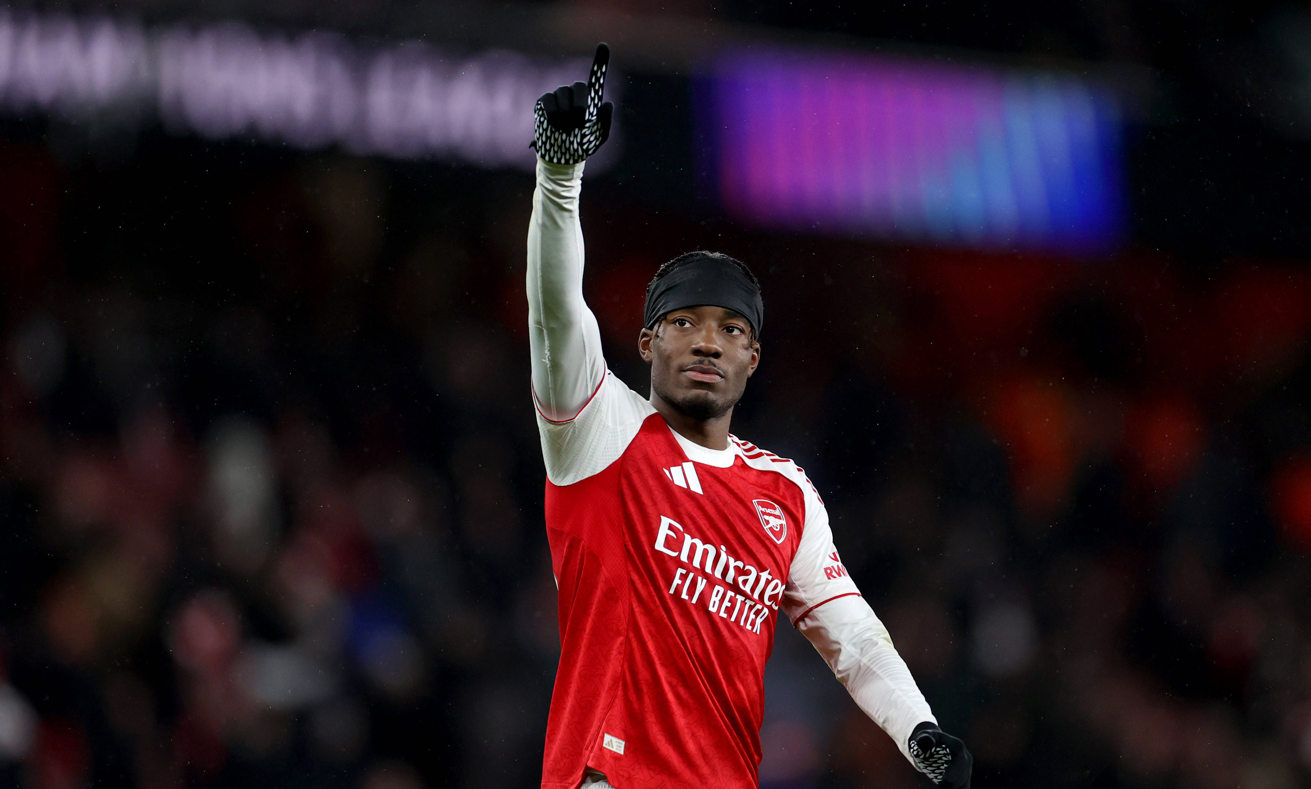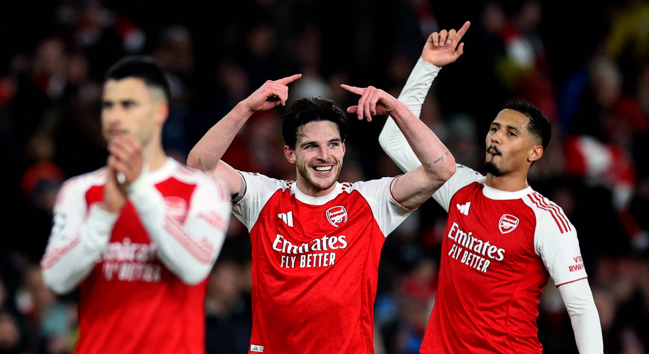 เมื่อวันที่ 26 พฤศจิกายน นักเตะอาร์เซนอล ไรซ์ (กลาง) ฉลองชัยชนะหลังจบการแข่งขัน ภาพโดย หลี่ หยิง สำนักข่าวซินหัว