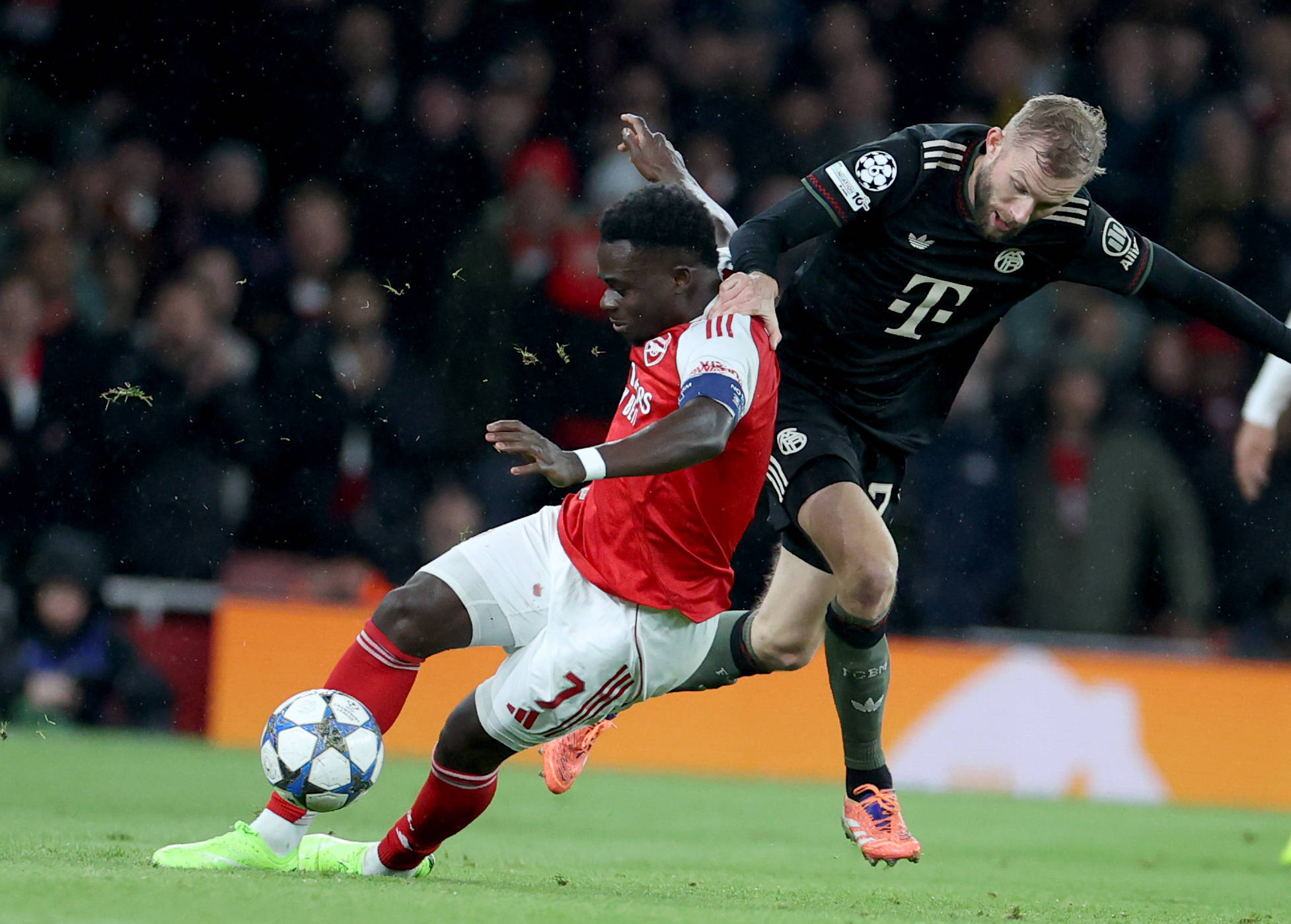 เมื่อวันที่ 26 พฤศจิกายน บูกาโย่ ซาก้า ของอาร์เซนอล (ซ้าย) แย่งบอลกับเบนจามิน ปาวาร์ด ของบาเยิร์น มิวนิค ภาพโดย หลี่ หยิง สำนักข่าวซินหัว