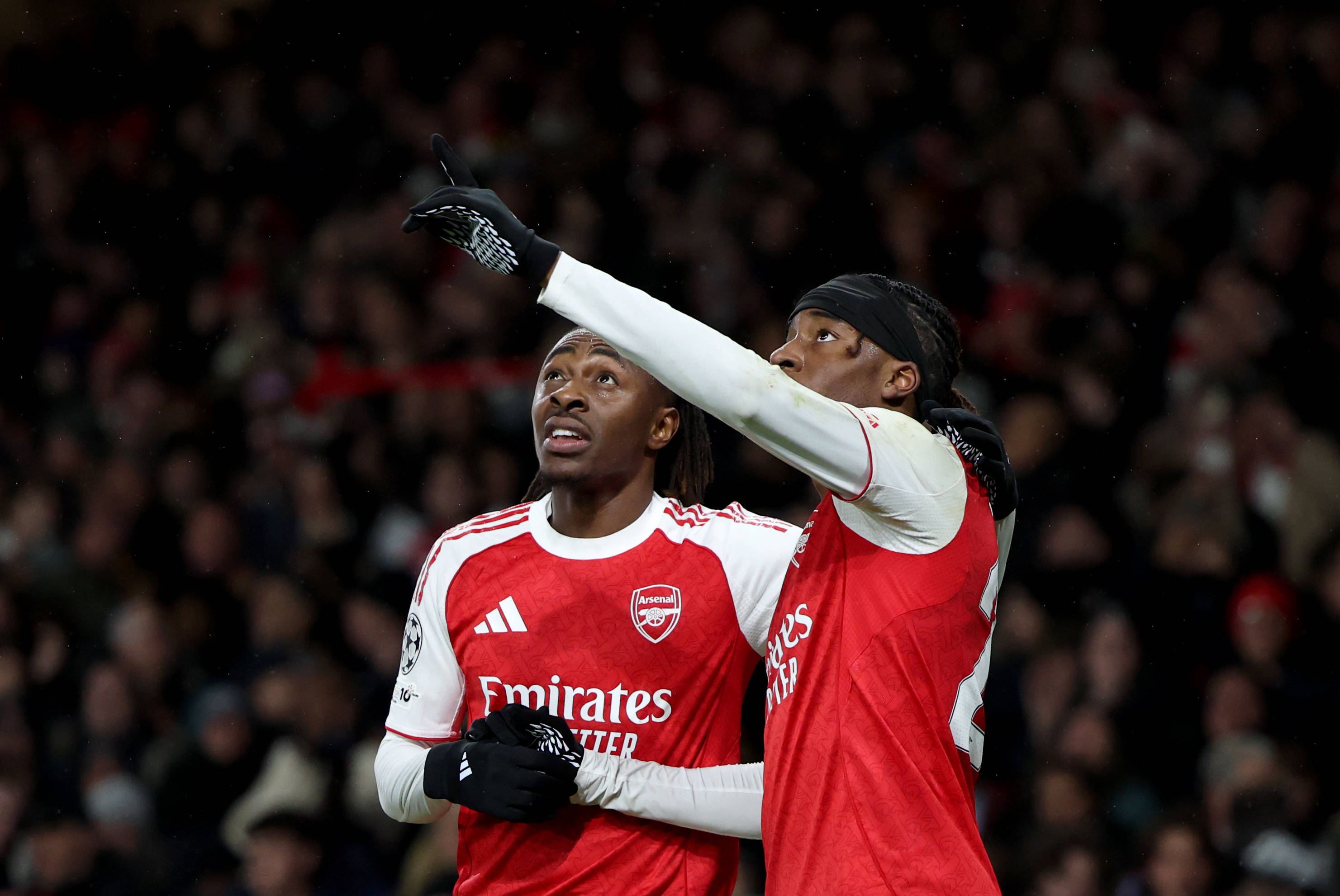 เมื่อวันที่ 26 พฤศจิกายน กาเบรียล มาร์ติเนลลี นักเตะอาร์เซนอล (ขวา) ฉลองกับเพื่อนร่วมทีม วิล ฟอดิน หลังจากทำประตูได้ ภาพโดย หลี่ อิง, สำนักข่าวซินหัว