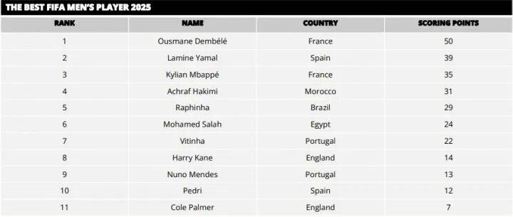 ผู้ชนะในที่สุด เดมเบเล่ ได้คะแนน 50 คะแนน ยามาลได้ 39 คะแนน และเอ็มบัปเป้ได้ 35 คะแนน ตามมาด้วย อาชราฟ, ราฟินญา, ซาลาห์, วิตินญา, เคน, นูโน่ เมนเดส, เปดรี และพาลเมอร์
