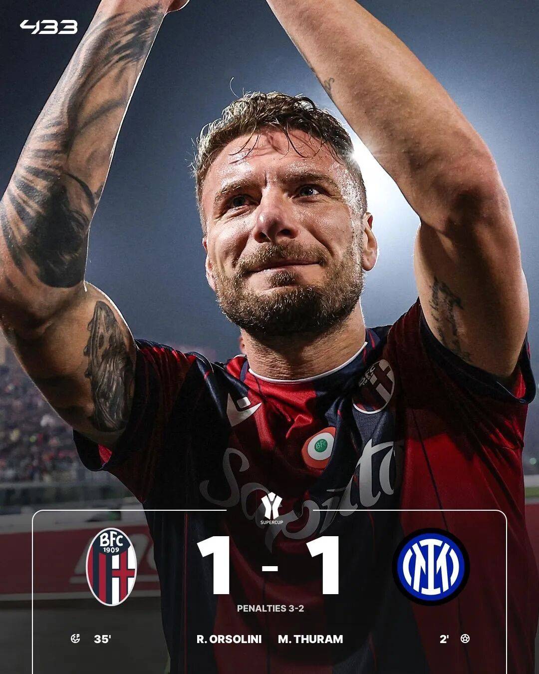การแข่งขันฟุตบอลซูเปอร์คัพอิตาลี รอบรองชนะเลิศ ระหว่างโบโลญญาและอินเตอร์ มิลาน จัดขึ้นที่สนามกีฬาของมหาวิทยาลัยกษัตริย์ซาอูด ในครึ่งแรก ตูเร่เปิดสกอร์ด้วยการยิงประตูอย่างรวดเร็วเพียงสองนาทีต่อมา จากนั้น บิสเซ็คทำแฮนด์บอลในเขตโทษ ซึ่งออร์โซลินีเป็นผู้ยิงจุดโทษเข้าไป