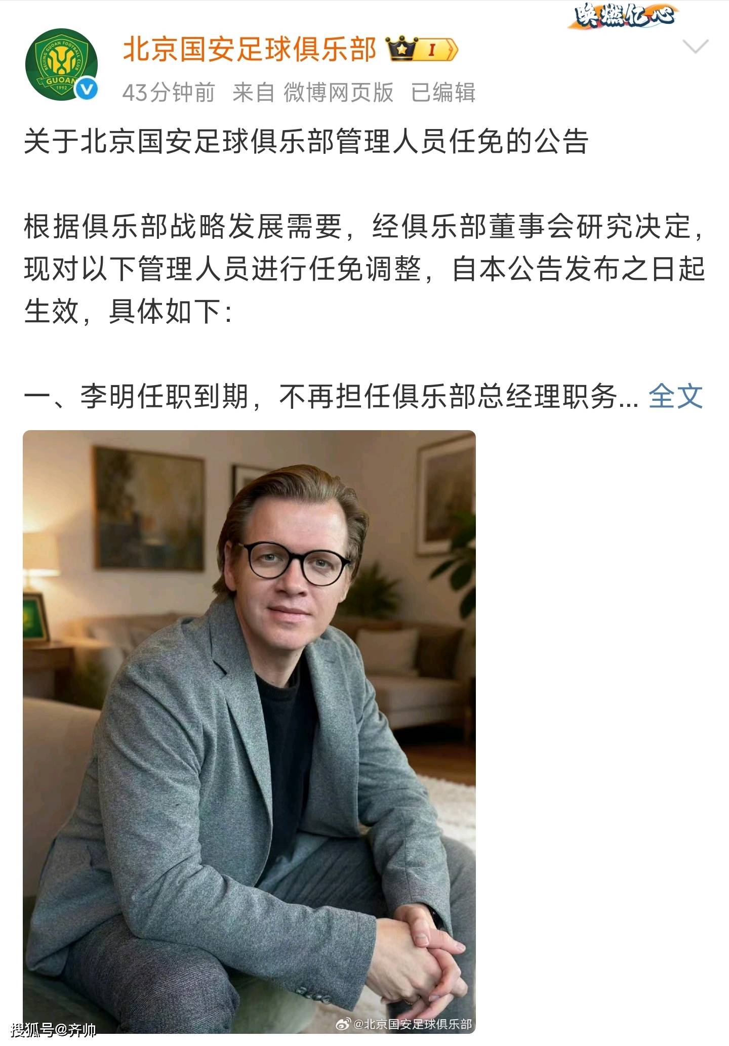 ประกาศอย่างเป็นทางการเวลา 10:00 น.! หลี่ หมิง ลาออกจากตำแหน่งผู้จัดการทั่วไปของปักกิ่ง กั๋วอัน โดยมี มา ยงหมิง ชาวเยอรมัน เข้ารับตำแหน่งแทน_ผู้เล่น_เอฟเอ คัพ_เซี่ยงไฮ้