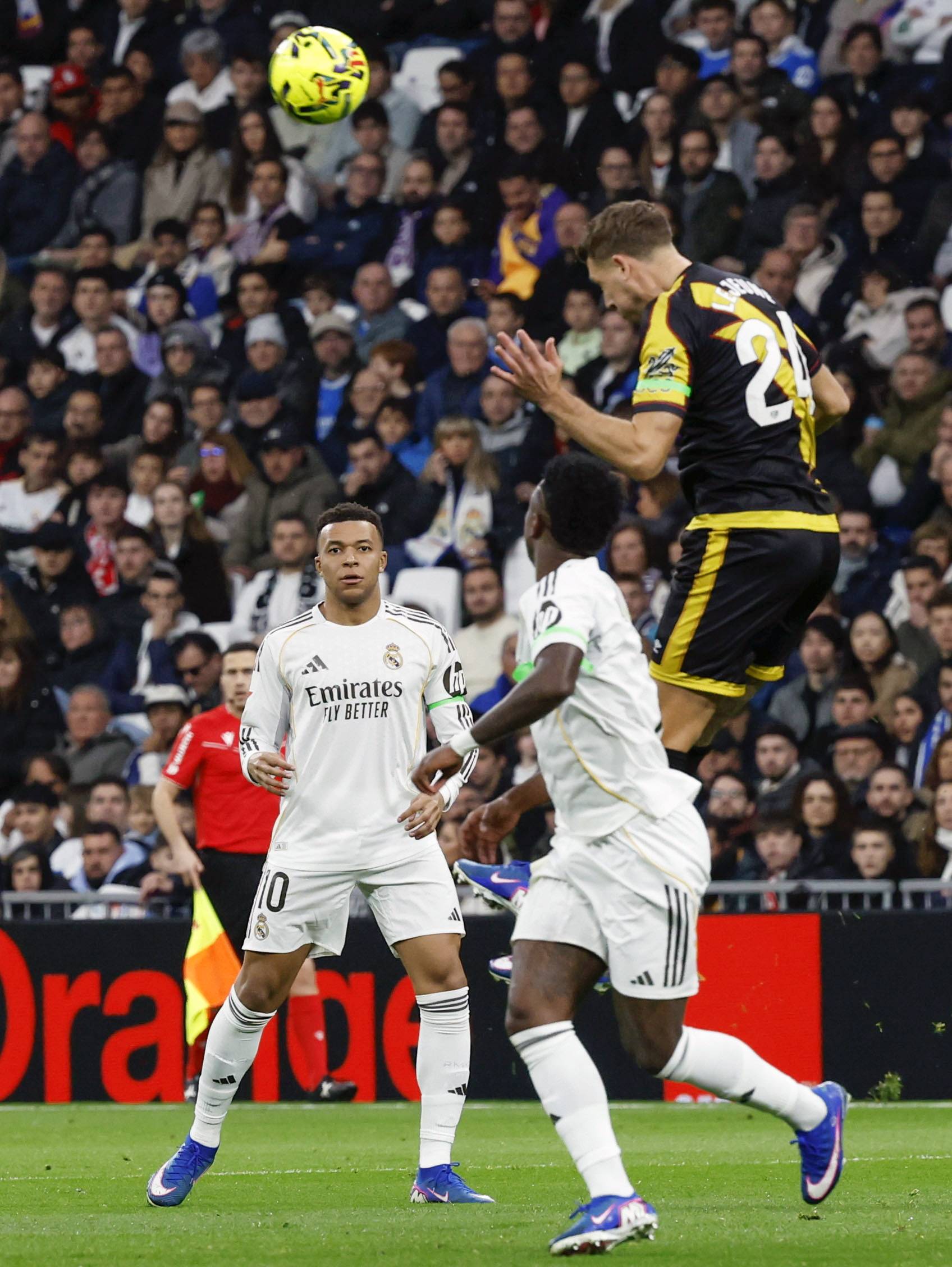 เมื่อวันที่ 1 กุมภาพันธ์ คีเลียน เอ็มบัปเป้ ของเรอัล มาดริด (ขวา) ท้าทาย ลอเรนเต้ ของราโย บาเยกาโน่ (ซ้าย) และ ชาบาร์เรีย ระหว่างการแข่งขัน ซินหัว/EPA