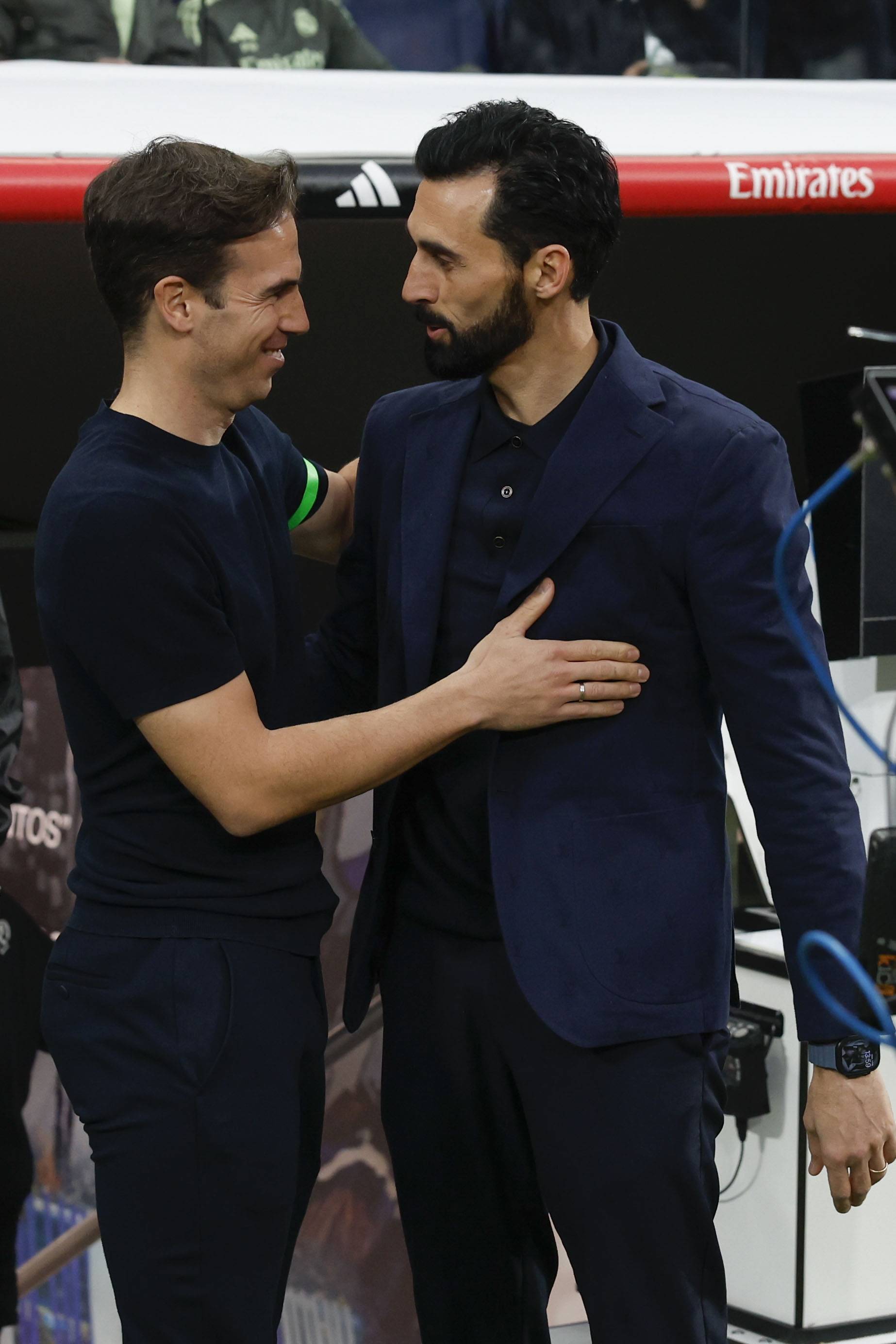 เมื่อวันที่ 1 กุมภาพันธ์ อัลบาโร่ อาร์เบลัว ผู้จัดการทีมเรอัล มาดริด (ขวา) กำลังแลกเปลี่ยนคำพูดกับปาโบล เปเรซ ผู้จัดการทีมราโย บาเยกาโน่ ก่อนการแข่งขัน ซินหัว/EPA