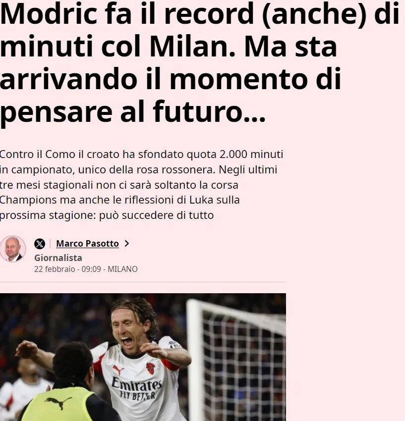 ตามรายงานของ La Gazzetta dello Sport, ลูก้า โมดริช อาจเลือกที่จะกลับไปยังดินาโม ซาเกร็บ หลังจบการแข่งขันฟุตบอลโลกในปีนี้ แม้ว่าเอซี มิลาน จะมีตัวเลือกในการขยายสัญญาออกไปอีกหนึ่งปี และต้องการเก็บกองกลางตำนานวัย 40 ปีไว้กับทีมต่อไป แต่การตัดสินใจสุดท้ายขึ้นอยู่กับตัวนักเตะเอง นอกจากนี้ ความเป็นไปได้ที่โมดริชจะประกาศเลิกเล่นหลังจบฤดูกาลนี้ยังไม่สามารถตัดทิ้งได้ ทำให้อนาคตของเขาไม่แน่นอน