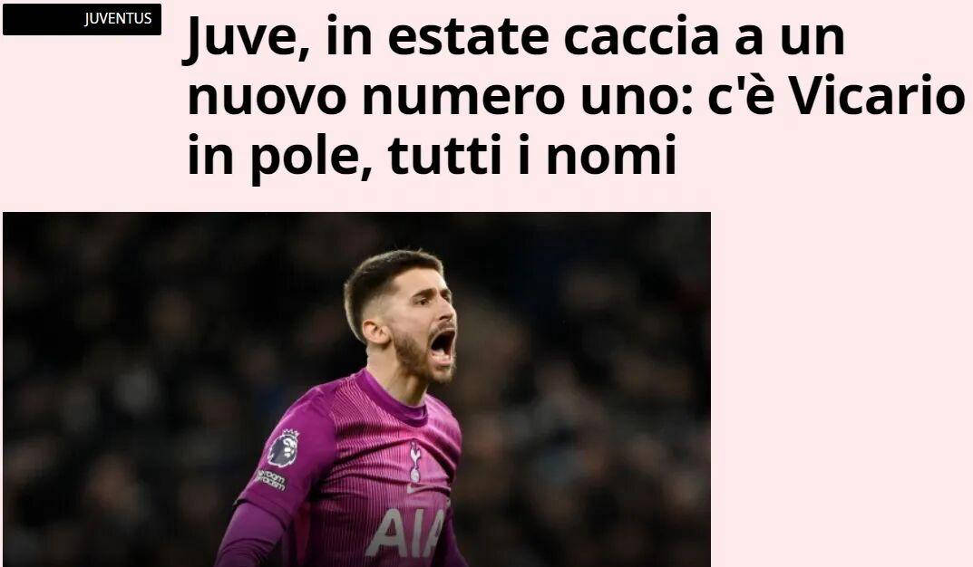 ตามรายงานของ La Gazzetta dello Sport ยูเวนตุสยังคงมองว่า วิคาริโอ เป็นเป้าหมายหลักในการเสริมทัพตำแหน่งผู้รักษาประตูในช่วงตลาดซื้อขายนักเตะฤดูร้อนนี้ ผู้รักษาประตูชาวอิตาลีวัย 29 ปีรายนี้ปัจจุบันเล่นให้กับท็อตแน่ม ฮ็อตสเปอร์ส โดยมีสัญญาจนถึงปี 2028 ยูเวนตุสต้องเผชิญกับการแข่งขันที่ดุเดือดจากอินเตอร์ มิลานในการคว้าลายเซ็นของเขา