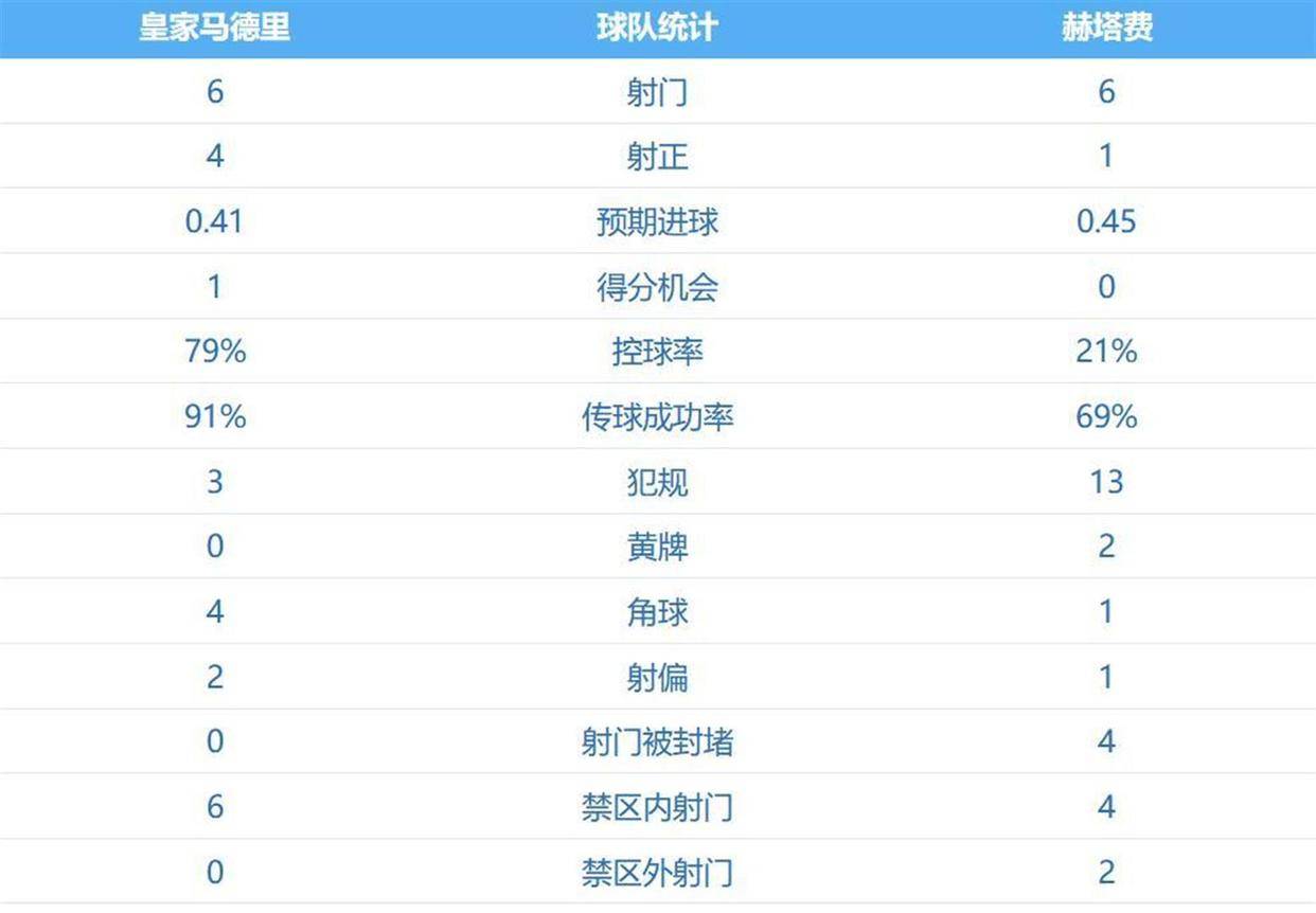 กองหน้าของเฮอร์ตาเฟ่ ซาเทรียโน ยิงบอลนอกกรอบเขตโทษอย่างโกรธจัด และบอลก็ดึงส่วนโค้งแปลก ๆ ไปที่ทางตันโดยตรง คลื่นโลกนี้ทำให้เบอร์นาเบวตกไปในความเงียบในทันที และทีมเยือนก็นำ 1-0 อย่างกะทันหัน ก่อนจบครึ่ง ริโก้มีโอกาสได้ลูกเดียวอีกนัด การยิงประตูและเสาประตูพลาดไป และเรอัล มาดริดก็หนีไปได้ ข้อมูลแสดงให้เห็นว่าเรอัล มาดริดยิงเข้ากรอบ 4 ประตู แต่ทำประตูไม่ได้ในครึ่งแรก และเกตาเฟ่ขึ้นนำด้วยการยิงเพียงครั้งเดียว