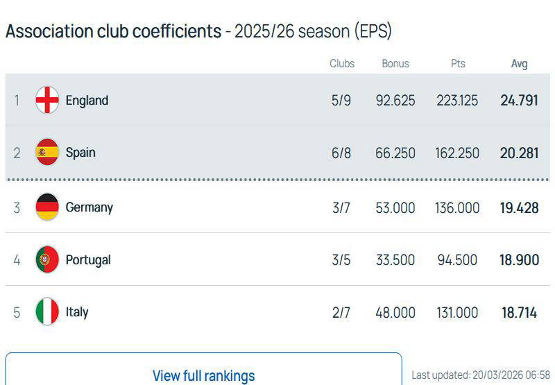 ตามอันดับล่าสุดของยูฟ่า ผลงานแชมเปี้ยนส์ลีกของพรีเมียร์ลีกไม่ดี แต่การแข่งขันรองในยุโรปสองรายการทำได้ดี และแม้ว่าการเป็นผู้นำจะหดตัวเล็กน้อยเมื่อเทียบกับเมื่อก่อน แต่ก็ยังรักษาชัยชนะได้ 4.5 แต้ม ทีมลาลีกาทั้ง 6 ทีมได้ก้าวขึ้นสู่ 16 อันดับแรก และตอนนี้แซงหน้าบุนเดสลีกาแล้ว และความได้เปรียบของแต้มได้ขยายเป็น 0. 8 นาทีหรือมากกว่านั้น ทีมโปรตุเกส Super League 3 ทำผลงานได้อย่างต่อเนื่อง และคะแนนเพิ่มขึ้นเป็นอันดับที่สี่ แซงหน้าเซเรีย อา โรงไฟฟ้าแบบดั้งเดิม ซึ่งสะท้อนถึงแนวโน้มโดยรวมของฟุตบอล Apennine เป็นที่น่าสังเกตว่าทีมชาติอิตาลีกำลังจะชกในเพลย์ออฟ ถ้าแพ้ก็อาจจะพลาดฟุตบอลโลกไปสามครั้งติดต่อกันและสถานการณ์ก็น่าเป็นห่วง