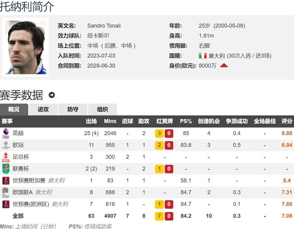 Tonali มาจากการฝึกเยาวชนของ Brescia ในปี 2020 ผู้เล่นเข้าร่วมกับเอซี มิลานด้วยค่าธรรมเนียมการโอน 5 ล้านยูโรในช่วงซัมเมอร์ปี 2020 จากนั้นจึงเช่าให้เบรสชาเพื่อเล่น ผู้เล่นกลายเป็นดาราเซเรียอาในมิลาน และในช่วงฤดูร้อนปี 2023 พวกเขาเข้าร่วมนิวคาสเซิลจากเอซี มิลานด้วยเงิน 60.8 ล้านยูโร