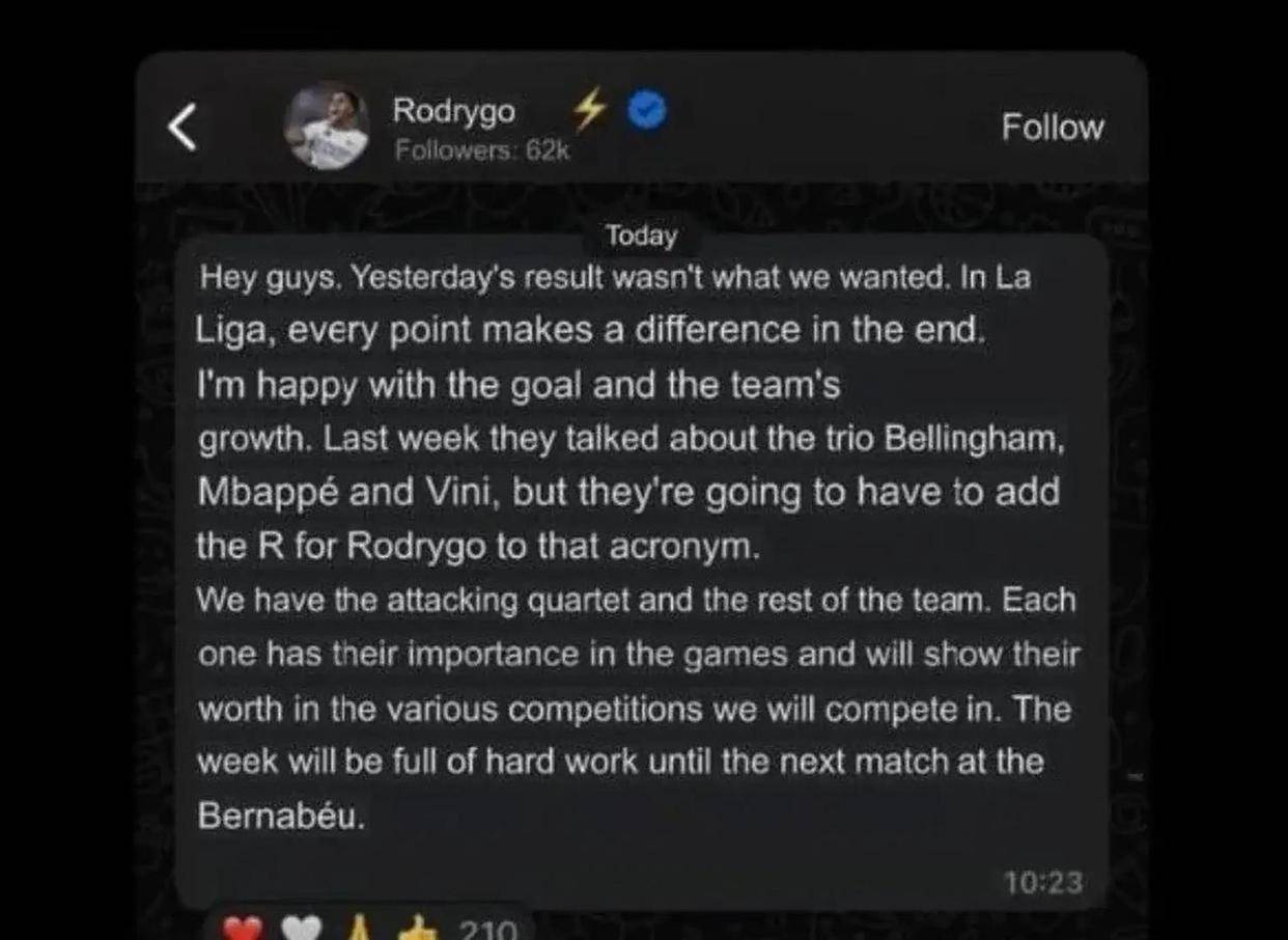 ในเดือนสิงหาคม 2024 ในรอบแรกของลาลีกา เรอัล มาดริด เสมอกับมายอร์ก้า 1-1 และประตูเดียวสำหรับทีมที่ทำประตูได้คือโรดริโก หลังเกม โซเชียลมีเดียของเขามีประโยคว่า "ทุกคนกำลังพูดถึง BMV แต่ต้องเพิ่มชุดค่าผสมนี้ R!" สถานะนี้ถูกลบอย่างรวดเร็ว แต่ความคับข้องใจและไม่เต็มใจได้แพร่กระจายไปทั่วอินเทอร์เน็ต