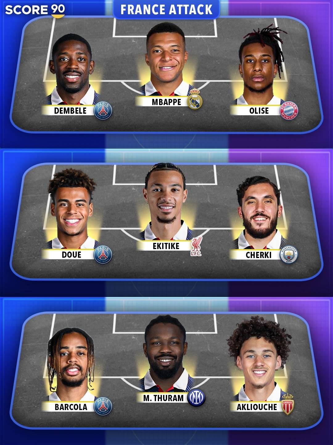 กองหน้าชาวฝรั่งเศสสามารถปล่อยไตรเดรนกองหน้าได้สามชุด และมูลค่ารวมของผู้เล่นสูงถึง 8 5.5 พันล้านยูโร ในบรรดากองหน้า 10 อันดับแรกของวงการฟุตบอล นักเตะชาวฝรั่งเศสครองครึ่งประเทศ (5 คน) แม้แต่เซตที่สามก็เป็นความฝันของทีมที่แข็งแกร่งในยุโรปและสหรัฐอเมริกา