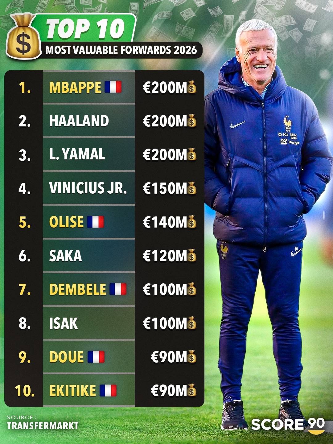 กองหน้าสิบอันดับแรกในวงการฟุตบอลคือ 200 ล้านยูโรMbappe, Harland, Yamal; 150 ล้านยูโร วินิซิอุส; 140 ล้านยูโรออลล์ซีย์, 120 ล้านยูโรของ Saka; 100 ล้านยูโรDumele และ Isaac, 90 ล้านยูโรและEquitik