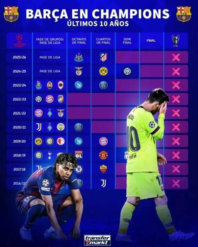 หลังจากตกรอบไป สื่อยุโรปบางสื่อได้จับตาดูผลการแข่งขันแชมเปี้ยนส์ลีกของบาร์เซโลนาในช่วง 10 ฤดูกาลที่ผ่านมา ซึ่งผลงานที่ดีที่สุดคือสองครั้งเพื่อเข้าสู่รอบรองชนะเลิศ และผลงานที่แย่ที่สุดสองรายการอยู่ในรอบแบ่งกลุ่ม โดยเฉพาะในฤดูกาล 2024-25 และ 2018-19 บาร์เซโลนาแพ้อินเตอร์ มิลาน และลิเวอร์พูลในรอบรองชนะเลิศ และตกเป็นแชมป์ นอกจากนี้ ในฤดูกาล 2023-24 พวกเขาแพ้ปารีสใน 8 อันดับแรก และในสองฤดูกาลก่อนหน้า พวกเขาทั้งหมดตกอยู่ในรอบแบ่งกลุ่ม นอกจากนี้ ในฤดูกาล 2020-21 พวกเขาแพ้ปารีสใน 16 อันดับแรก และรอบรองชนะเลิศในฤดูกาล 2019-20 แพ้บาเยิร์น ในสองฤดูกาลของปี 2016-17 และ 2017-18 พวกเขาแพ้ให้กับยูเวนตุสและโรมในรอบรองชนะเลิศตามลำดับ