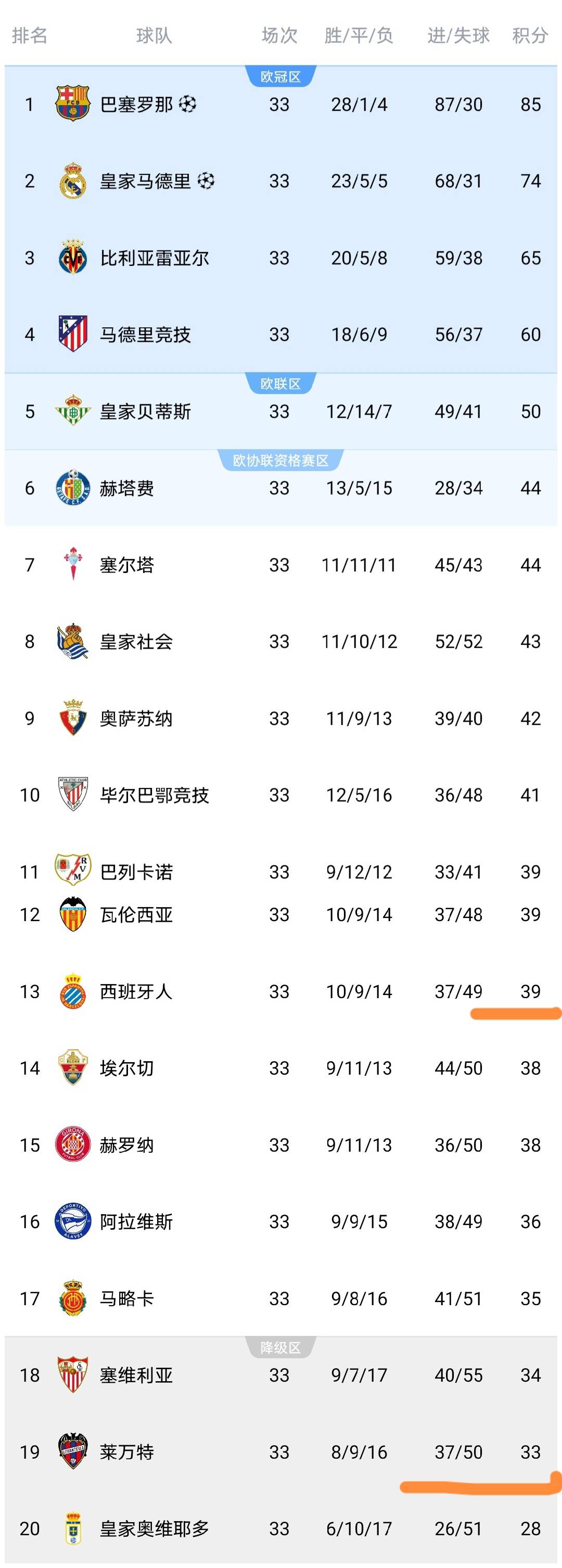 จะเห็นได้ว่าชาวสเปนเพิ่มขึ้น 39 แต้ม อยู่ในอันดับที่ 13 ในขณะที่ทีมเลแวนเตสได้เพิ่มขึ้นเป็น 33 แต้ม ยังคงอยู่ในอันดับที่ 19 ทีมเลบานเต้ 2 แต้มหลังเซฟโซนและยังมีหวังตกชั้น