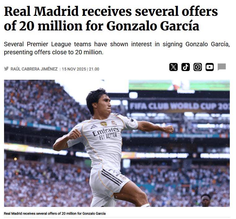 กอนซาโล การ์เซีย วัย 21 ปี ยังไม่ได้รับโอกาสเพียงพอในทีมชุดใหญ่ของเรอัล มาดริด โดยไม่สามารถทำประตูได้ใน 9 นัดในลาลีกาและแชมเปียนส์ลีกในฤดูกาลนี้ ตามรายงานของ The Echo เมื่อวันที่ 16 พฤศจิกายน สโมสรซันเดอร์แลนด์ของอังกฤษได้เข้าร่วมการแข่งขันเพื่อคว้าตัวกองหน้าดาวรุ่งชาวสเปนรายนี้ โดยยื่นข้อเสนอ 20 ล้านยูโรให้กับเรอัล มาดริด