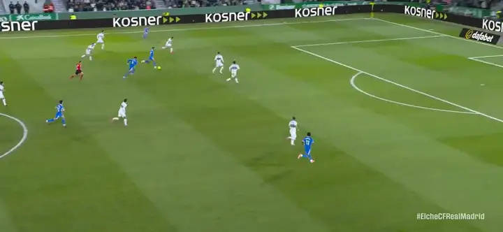 ตัวอย่างเช่น ในนาทีที่ 84 เรอัล มาดริด เสียประตูนี้ โดย โรดริเกซ ของเอลเช่ ยิงเข้าประตู ซึ่งเผยให้เห็นปัญหาของเซ็นเตอร์แบ็คและแบ็คขวาของพวกเขา