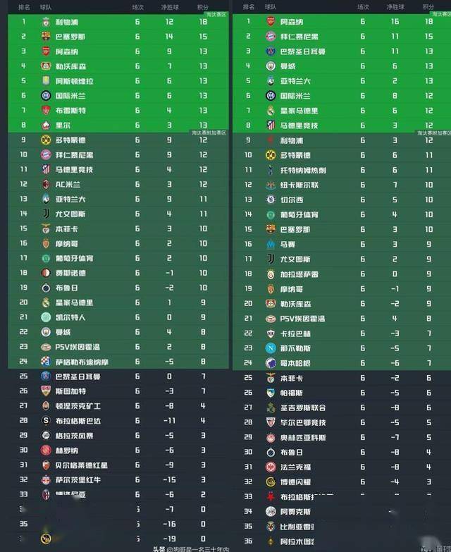 เมื่อเปรียบเทียบกับตารางคะแนนแชมเปียนส์ลีกหลังจากผ่านไปหกนัดในระยะเดียวกันของปีที่แล้ว สถานการณ์เป็นดังนี้:
