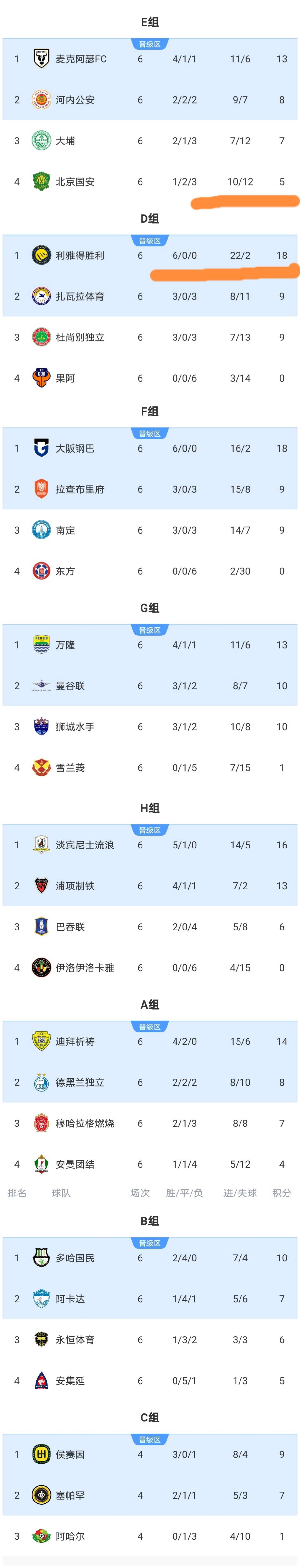 อัปเดตอันดับ: ตามกฎเริ่มต้น ทีมอันดับหนึ่งและสองของแต่ละกลุ่มจะผ่านเข้าสู่รอบน็อคเอาท์ ทีมปักกิ่ง กั๋วอัน จากกลุ่ม E จบอันดับสุดท้ายและตกรอบ ขณะที่ทีมไท่ผ่อ และทีมอีสเทิร์น จากฮ่องกงก็ไม่สามารถผ่านเข้ารอบได้เช่นกัน ถือว่าทีมจีนประสบความล้มเหลวอย่างสิ้นเชิง ในกลุ่ม D ทีมอัล นาสเซอร์ คว้าอันดับหนึ่งด้วยคะแนน 18 คะแนนอย่างเด็ดขาด ขณะที่ทีมกัมบะ โอซาก้า จากญี่ปุ่น และทีมโพฮัง สตีลเลอร์ส จากเกาหลีใต้ ก็สามารถผ่านเข้ารอบได้เช่นกัน