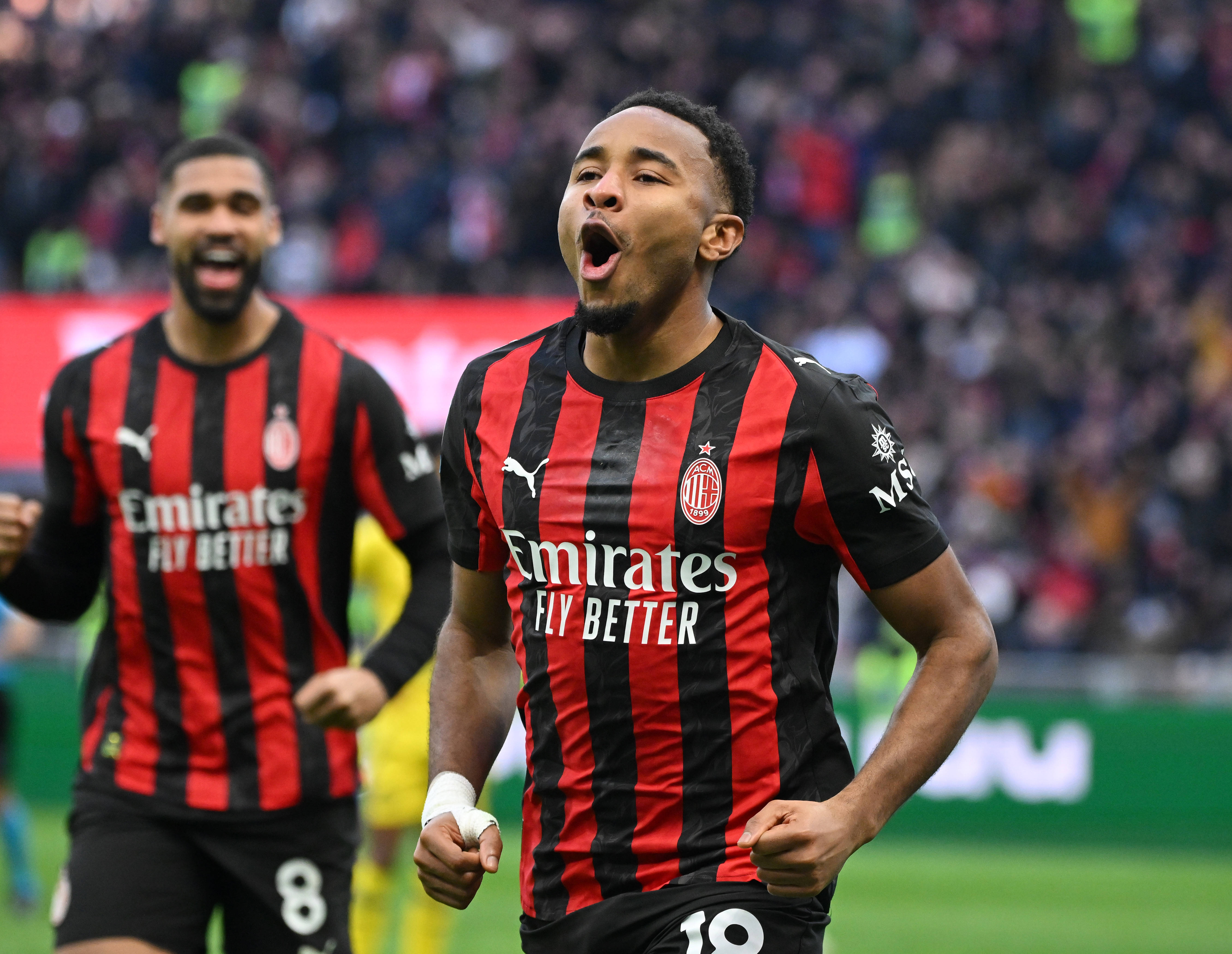 เมื่อวันที่ 28 ธันวาคม คริสโตเฟอร์ เอ็นคุนคู นักเตะเอซี มิลาน (ขวา) ฉลองประตูที่สองของเขาในนัดนี้ สำนักข่าวซินหัว (ภาพโดย อัลแบร์โต ลิงเรีย)