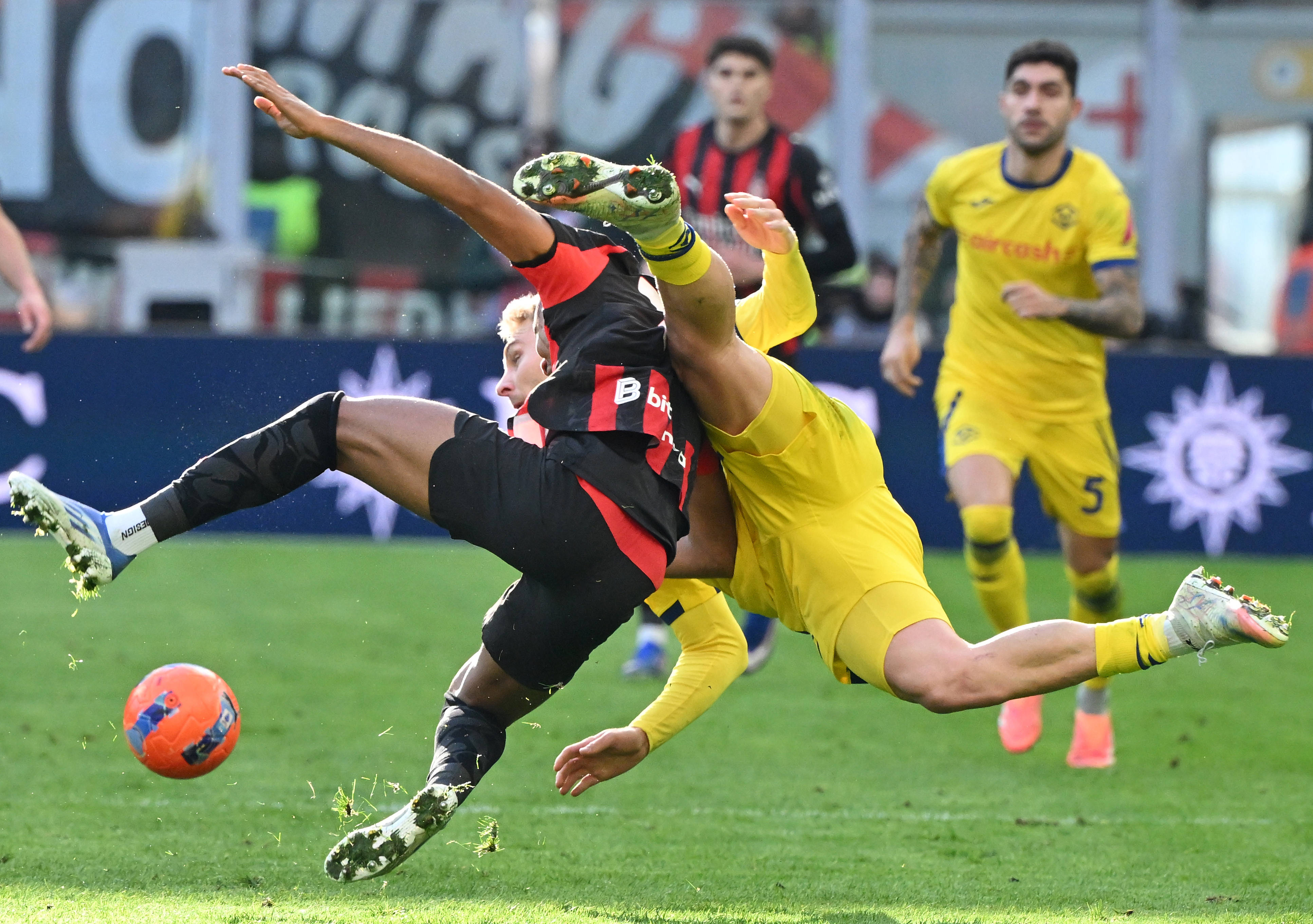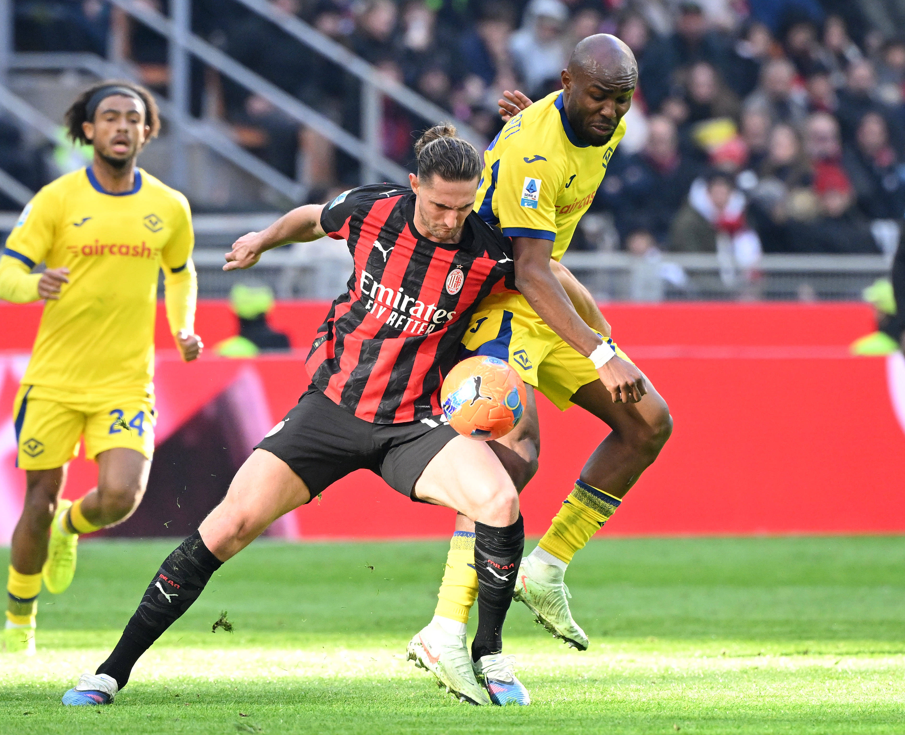 เมื่อวันที่ 28 ธันวาคม อาเดรียง ราบิโอต์ (กลาง) ของเอซี มิลาน ท้าทาย ลอเรนโซ มุสลาติ (ขวา) ของเฮลลาส เวโรนา ระหว่างการแข่งขัน สำนักข่าวซินหัว (ภาพโดย อัลแบร์โต ลิงเกีย)