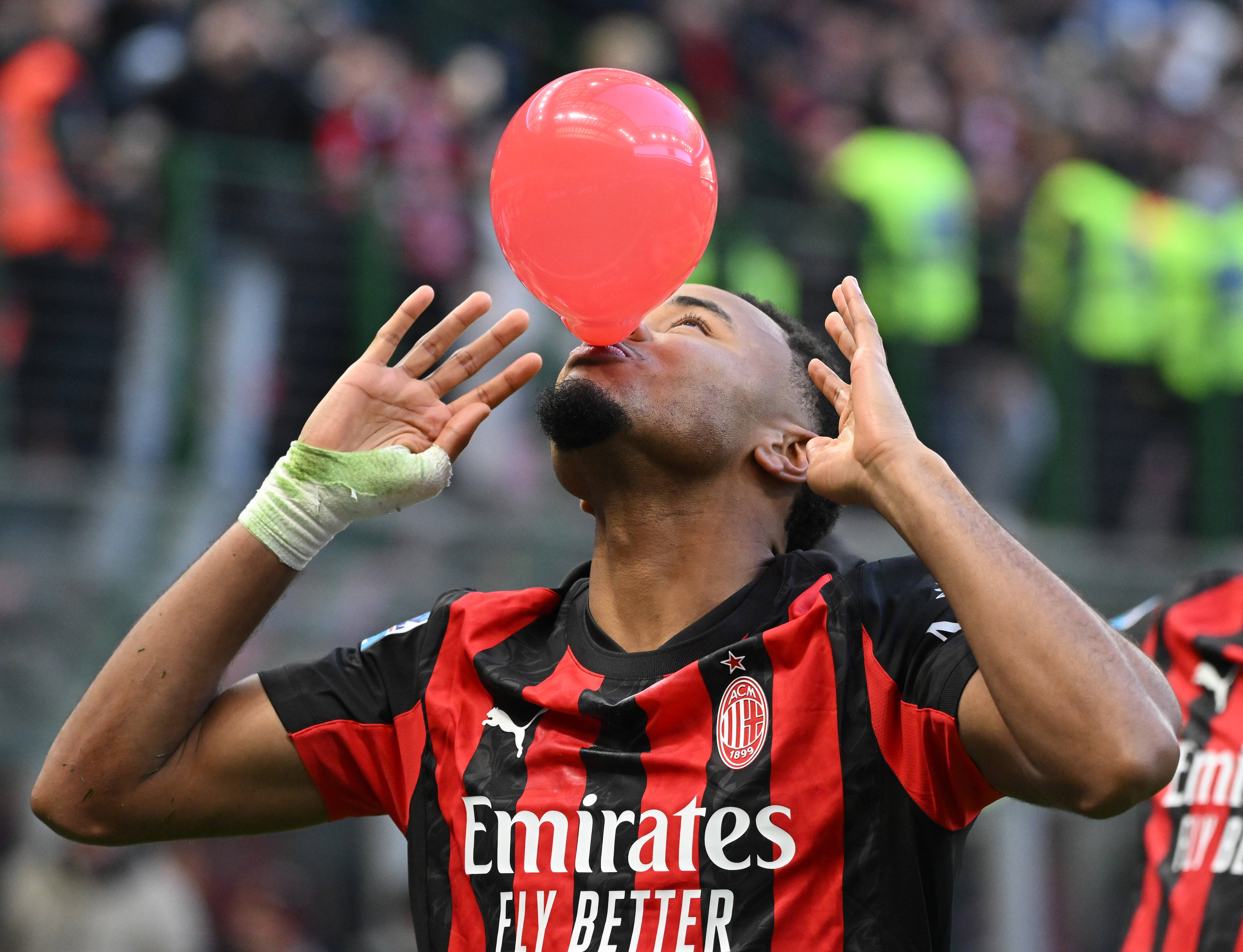 เมื่อวันที่ 28 ธันวาคม คริสโตเฟอร์ เอ็นคุนคู นักเตะของเอซี มิลาน ฉลองประตูแรกของเขาในนัดนี้ สำนักข่าวซินหัว (ภาพโดย อัลแบร์โต ลิงเกีย)