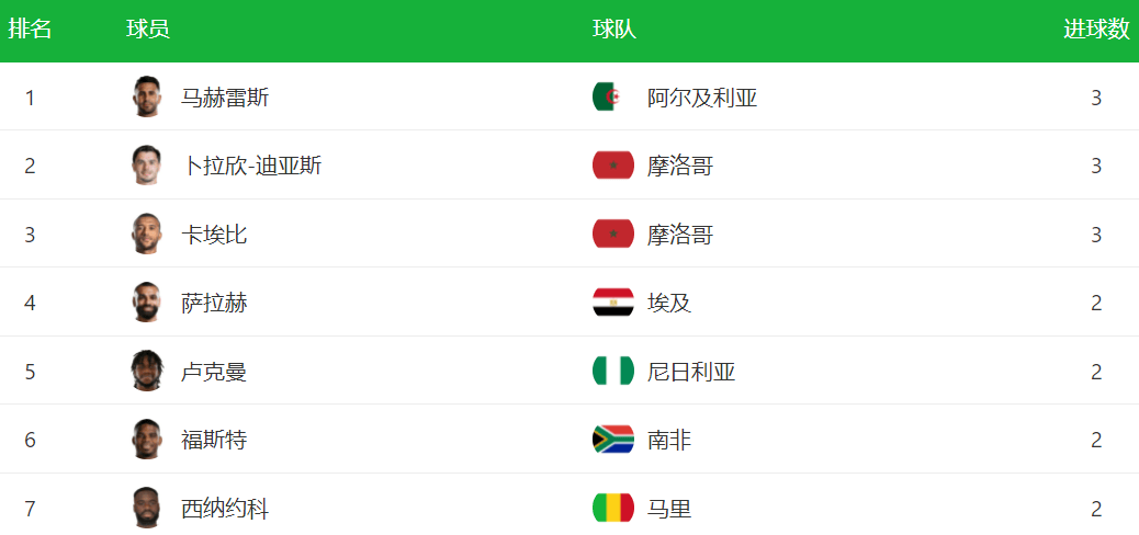 เห็นได้ชัดว่า บราฮิม ดิอาซ เป็นตัวเต็งที่ชัดเจนสำหรับรางวัลรองเท้าทองคำในทัวร์นาเมนต์นี้ ขณะนี้มีเพียงสามผู้เล่นเท่านั้นที่ทำประตูได้สามประตูในตารางผู้ทำประตู ดิอาซมีเพื่อนร่วมทีมอย่าง คาบี ที่ทำประตูได้สามครั้งเช่นกันหลังจากที่เคยเล่นในไชนีส ซูเปอร์ลีกมาก่อน คาอาบี วัย 32 ปี ยังคงแสดงให้เห็นถึงฟอร์มการแข่งขันที่ยอดเยี่ยม ริยาด มาห์เรซ ของแอลจีเรียก็ทำประตูได้สามครั้งเช่นกัน พิสูจน์ให้เห็นว่าเขาเป็นภัยคุกคามที่อันตรายที่สุดของทีม