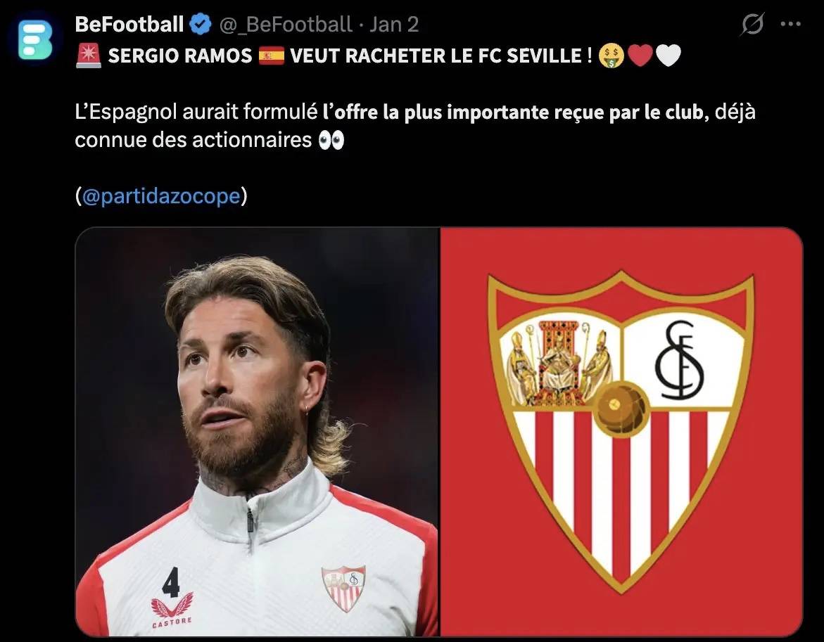 รามอส! รายงานระบุว่า รามอสได้ยื่นข้อเสนอเพื่อซื้อเซบีย่าแล้ว หากการเข้าซื้อกิจสำเร็จ รามอสจะย้ายไปอยู่ที่เซบิลลา อย่างไรก็ตาม เรื่องนี้ยังไม่แน่นอนในขณะนี้ และรามอสยังไม่ได้เปิดเผยเจตนาของเขาหากการเข้าซื้อกิจดำเนินต่อไป อย่างไรก็ตาม เขาเคยแสดงความปรารถนาที่จะทำตามรอยลูก้า โมดริช โดยจบอาชีพค้าแข้งที่สโมสรในฝันของเขา