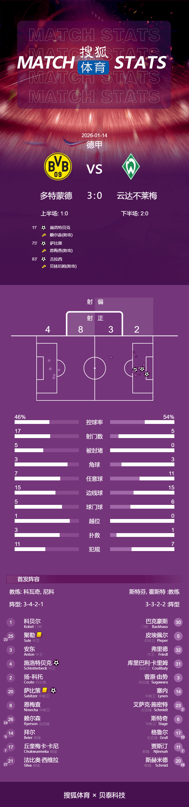เวลา 03:30 น. ตามเวลาปักกิ่ง วันที่ 14 มกราคม 2026 โบรุสเซีย ดอร์ทมุนด์ เปิดบ้านต้อนรับการมาเยือนของแวร์เดอร์ เบรเมน ในรอบที่ 17 ของบุนเดสลีกา ในครึ่งแรก ชล็อตเตอร์เบ็ค โหม่งทำประตูจากลูกแอสซิสต์ของไลส์เนอร์ ทำให้ดอร์ทมุนด์ขึ้นนำในครึ่งหลัง ซาบิตเซอร์และจิโรดงต่างทำประตูได้คนละหนึ่งลูก ปิดฉากชัยชนะอย่างขาดลอย 3-0 ให้กับโบรุสเซีย ดอร์ทมุนด์ เหนือแวร์เดอร์ เบรเมน และคว้าชัยชนะนัดแรกของปี 2026 ได้สำเร็จ