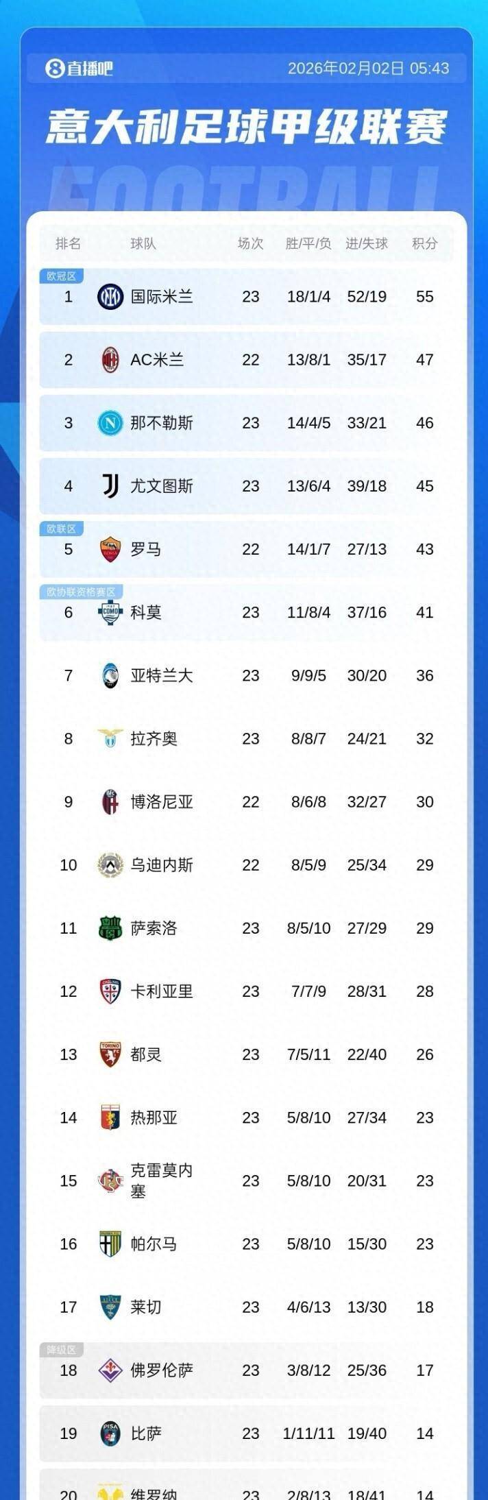 หลังจากการแข่งขันรอบที่ 23 ของเซเรีย อาสิ้นสุดลง ตารางคะแนนลีกได้เกิดการเปลี่ยนแปลงเล็กน้อยแต่มีนัยสำคัญ อินเตอร์ มิลาน คว้าชัยชนะอย่างสบาย 2-0 ในเกมเยือนเหนือ เครโมเนเซ ทำให้พวกเขามีคะแนนสะสมเพิ่มเป็น 55 คะแนน ขณะที่คู่แข่งร่วมเมือง เอซี มิลาน ซึ่งยังไม่ได้ลงสนามในรอบนี้ ยังคงมี 47 คะแนน