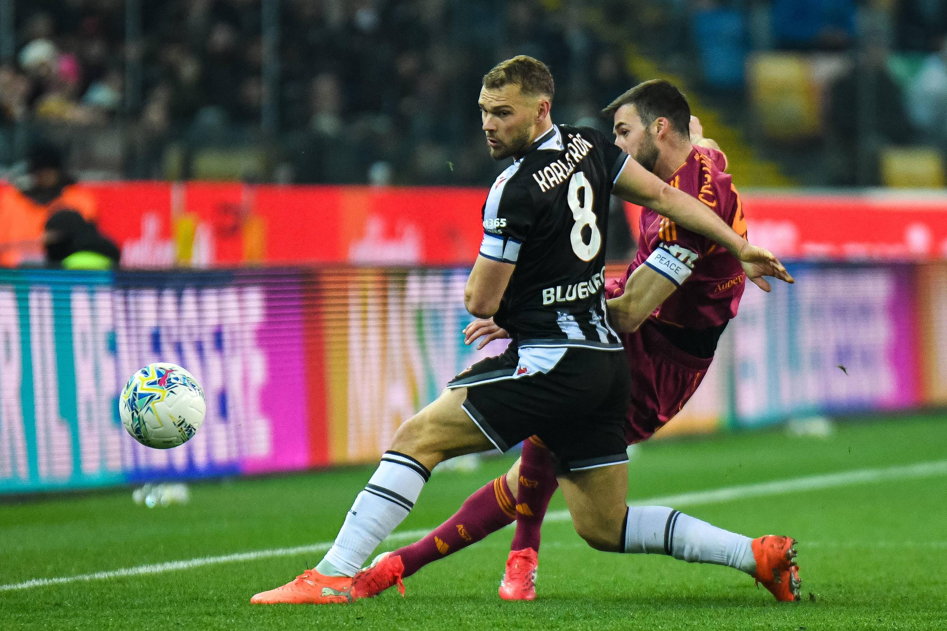 เมื่อวันที่ 2 กุมภาพันธ์ นักเตะของอูดิเนเซ่ มาเลน (ขวา) เข้าปะทะกับคริสเตนเซ่น นักเตะของโรม่า เพื่อแย่งบอล ชินหัว/EPA