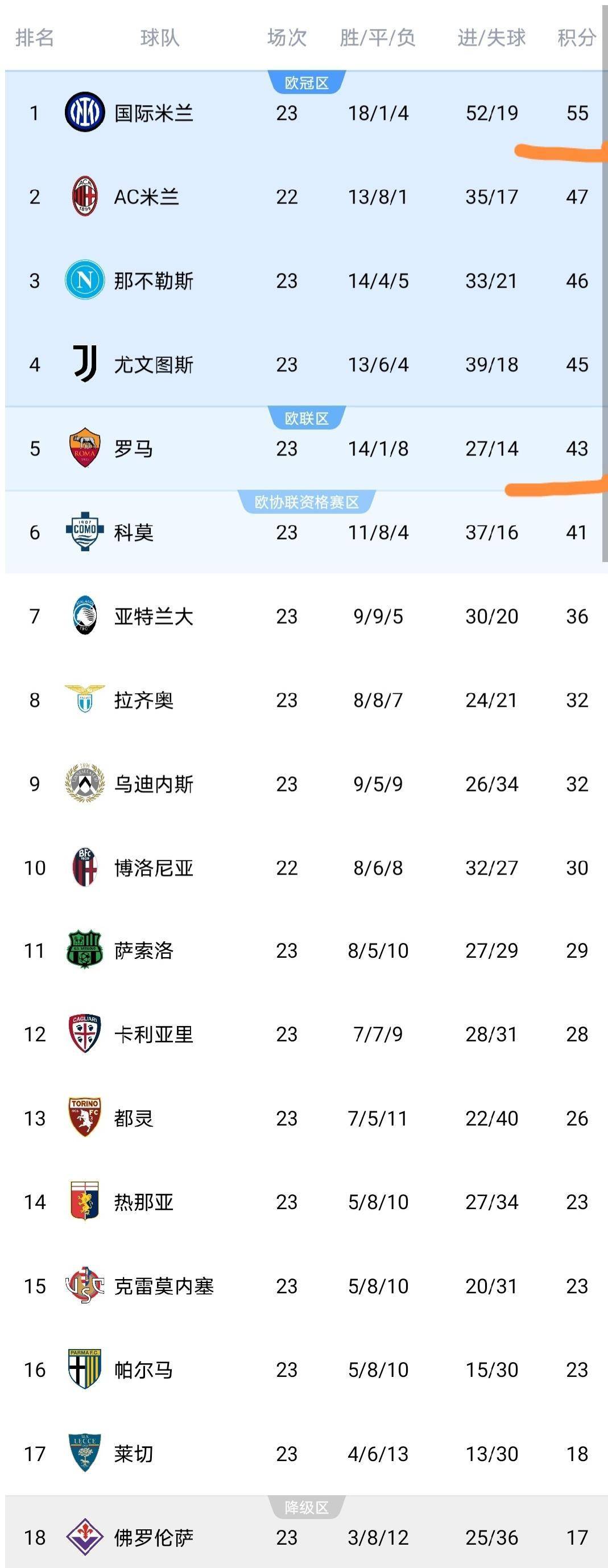 อินเตอร์ มิลาน นำเป็นจ่าฝูงในเซเรีย อา ด้วย 55 คะแนน ขณะที่ตารางคะแนนมีการเปลี่ยนแปลงครั้งใหญ่หลังจากโรม่าพ่ายแพ้อย่างน่าตกใจ 0-1 ต่อ อูดิเนเซ่ _แชมเปียนส์ลีก_ _นาโปลี_