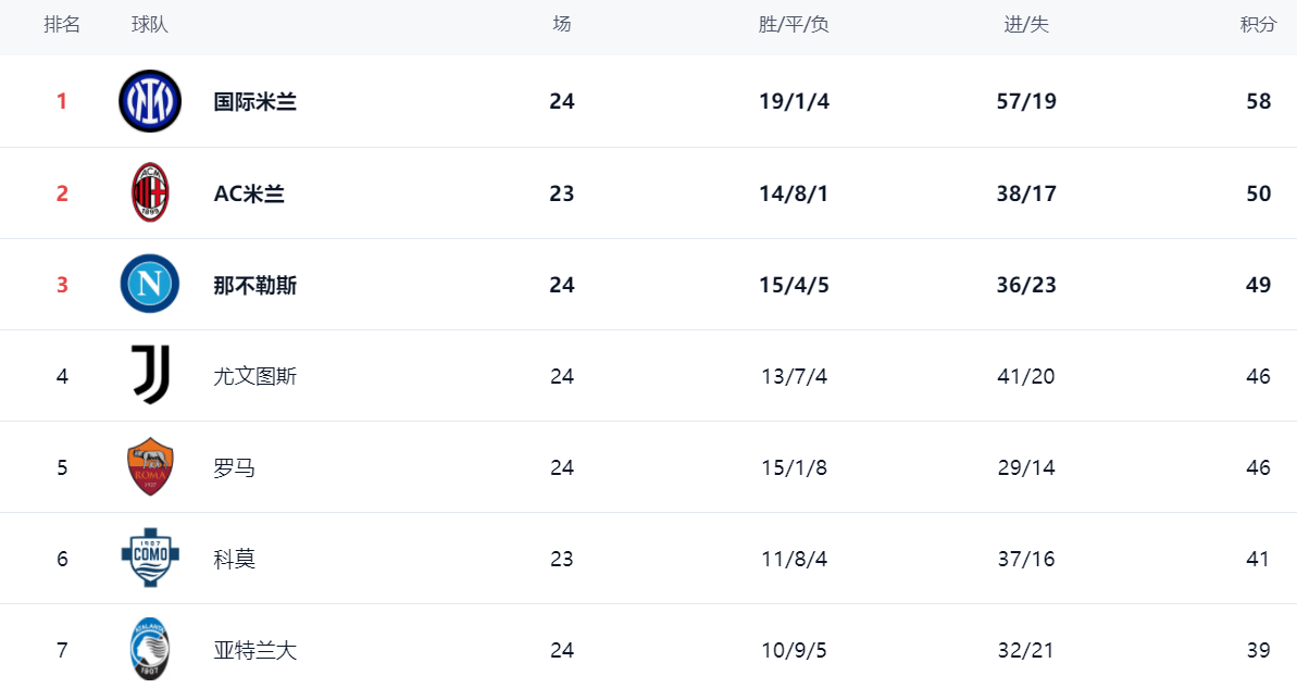 ในตารางลีก อินเตอร์ มิลาน ครองตำแหน่งจ่าฝูงด้วยคะแนน 58 คะแนน จากการชนะ 19 นัด เสมอ 1 นัด และแพ้ 4 นัด แม้ว่าอินเตอร์จะประสบกับความพ่ายแพ้พอสมควร แต่จำนวนนัดที่เสมอกลับต่ำอย่างน่าทึ่ง ขณะที่จำนวนชัยชนะที่นำเป็นอันดับหนึ่งในลีกทำให้พวกเขาครองตำแหน่งจ่าฝูงได้สำเร็จ เอซี มิลาน ตามหลังอยู่ 8 คะแนน ด้วยคะแนน 50 คะแนน อยู่ในอันดับสอง อย่างไรก็ตาม เอซี มิลาน ลงเล่นน้อยกว่า 1 นัด