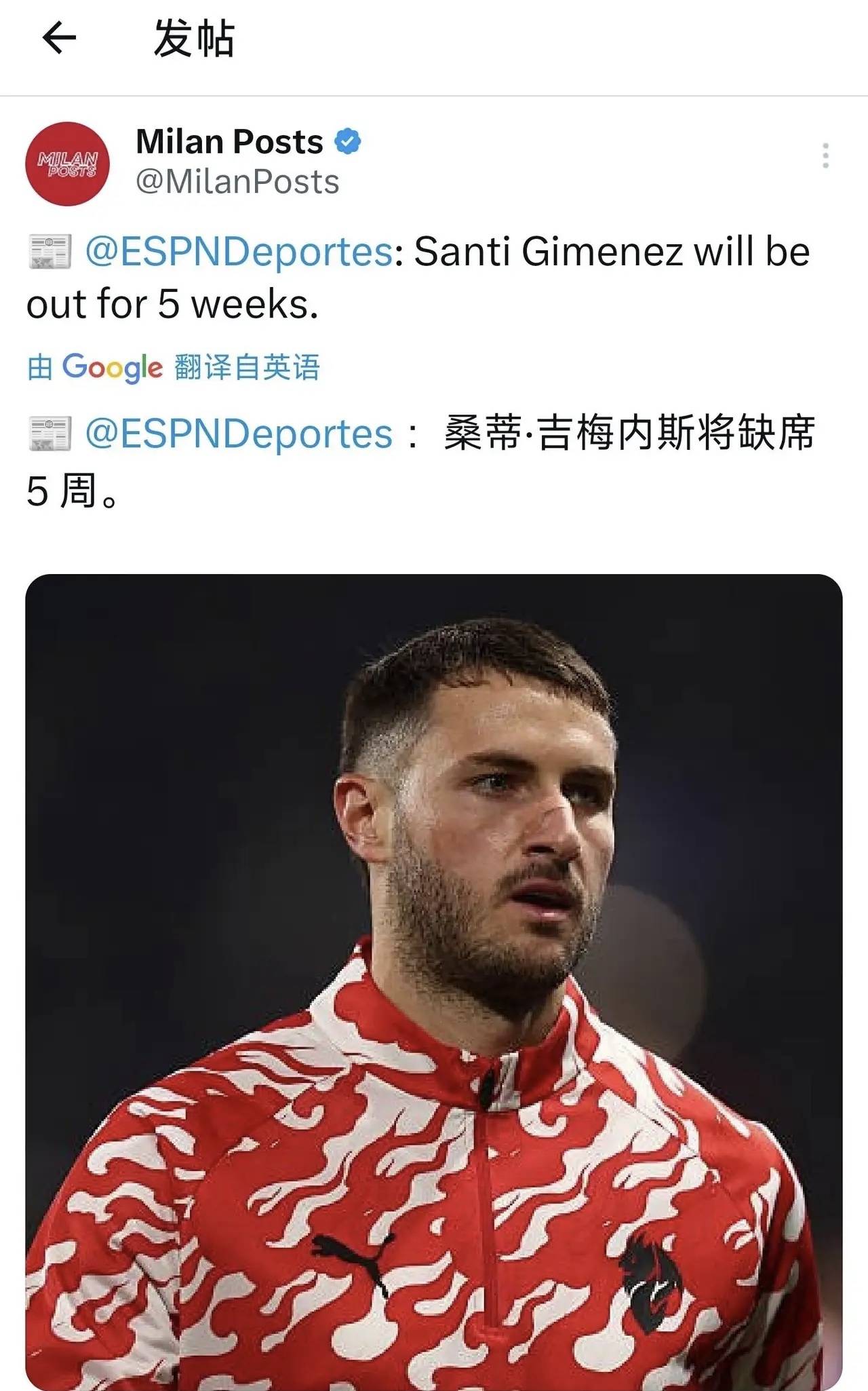 สื่อรายงานจากเซเรีย อา: กองหน้าของมิลาน, จิเมเนซ, จะต้องพักรักษาตัวเป็นเวลาห้าสัปดาห์เนื่องจากอาการบาดเจ็บ หลังจากที่เล่นผ่านความเจ็บปวดเพื่อสโมสร