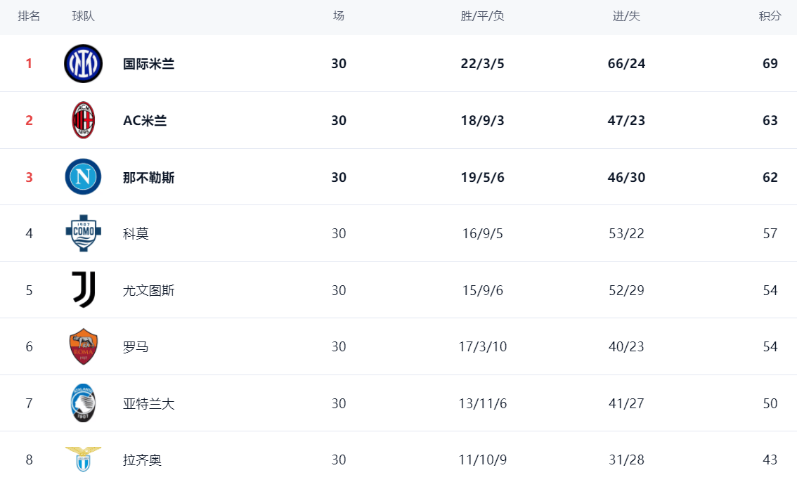 ในอันดับ อินเตอร์ มิลาน ยังคงครองตำแหน่งแรกในรายการ โดยมีสถิติชนะ 22 เสมอ 3 แพ้ 5 แพ้ 69 แต้ม อันดับหนึ่ง เอซี มิลาน ซึ่งรั้งอันดับสอง ทำได้เพียง 63 แต้ม ตามหลัง 6 แต้ม และไม่มีความหวังในการชิงแชมป์เพียงเล็กน้อย เนเปิลส์ตามมาด้วยคะแนน 62 คะแนน อันดับที่ 4 คือ Dark Horse Como ตัวใหญ่ด้วยคะแนน 57 คะแนน ยูเวนตุส ทำได้เพียง 54 คะแนน อันดับที่ 5 หลังจากโรม่าชนะ เขาก็ทำคะแนนได้ 54 แต้ม อันดับที่ 6 Atlant อยู่ที่ 7 ด้วยคะแนน 50 คะแนน ลาซิโอทำคะแนนได้เพียง 43 คะแนน อันดับที่ 8