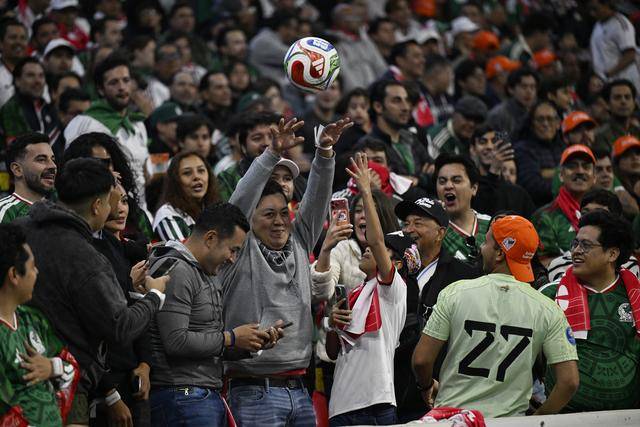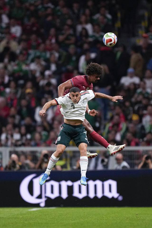 ↑ ผู้เล่นเม็กซิกัน Jimenez (ด้านหน้าขวา) ส่งบอลในเกม ภาพถ่ายโดยนักข่าวสำนักข่าว Xinhua Li Muzi
