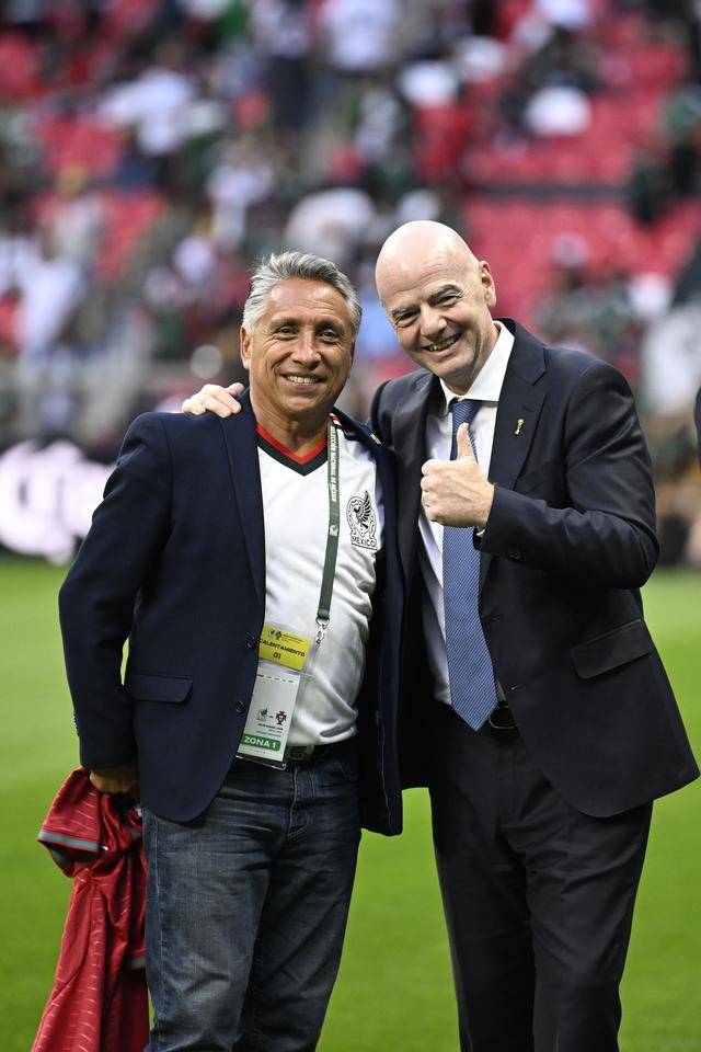 ↑ ฟีฟ่า ประธาน อินฟานี่โน (ขวา) กับ มานูเอล เนเกรตต์ นักเตะชาวเม็กซิกันในตำนานก่อนเกม ภาพถ่ายโดยนักข่าวสำนักข่าว Xinhua Li Muzi