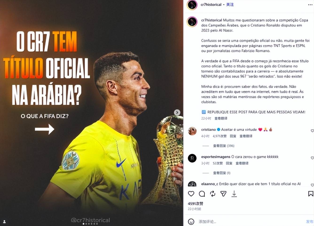 สำหรับว่าอัลลอฮ์เป็นงานอย่างเป็นทางการที่ FIFA ได้รับการยอมรับหรือไม่ แฟน ๆ ก็ทะเลาะกันทางอินเทอร์เน็ตเช่นกัน ในหมู่พวกเขา หมายเลขแฟนของ Cristiano Ronaldo @cr7historical เพิ่งโพสต์โพสต์สนับสนุน Cristiano Ronaldo ทำประตูได้ 967 ประตูและยืนยันว่า ESPN, Romano และสื่ออื่น ๆ พูดเรื่องไร้สาระโดยกล่าวว่า 6 ประตูที่ Cristiano Ronaldo ทำในมงกุฎ Alah ไม่ควรถูกหัก