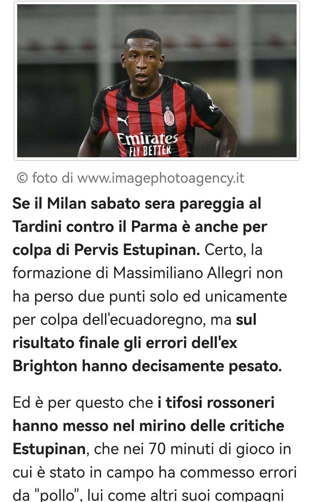 สื่อรายงานจากเซเรียอา: มิลานเสมอกับปาร์มา 2-2; เอสตูปินานและโฟฟาน่าเผชิญกับเสียงวิจารณ์จากแฟนบอล ต้องปรับปรุงผลงาน_ความผิดพลาดของปาร์มา_