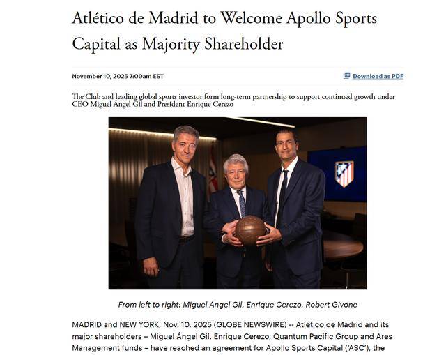 สำนักข่าวไช่เหลียน, 10 พฤศจิกายน (บรรณาธิการ ชี เจิ้งเฉิง)– อพอลโล โกลบอล แมเนจเมนท์ บริษัทจดทะเบียนในสหรัฐฯ และยักษ์ใหญ่ด้านไพรเวทอิควิตี้แห่งวอลล์สตรีท ประกาศเมื่อวันจันทร์ว่าได้บรรลุข้อตกลงกับผู้ถือหุ้นเดิมของสโมสรฟุตบอลยักษ์ใหญ่แห่งสเปน แอตเลติโก มาดริดโดยผู้จัดการสินทรัพย์จากวอลล์สตรีทรายนี้จะกลายเป็นผู้ถือหุ้นใหญ่ของทีมยักษ์ใหญ่แห่งลาลีกา