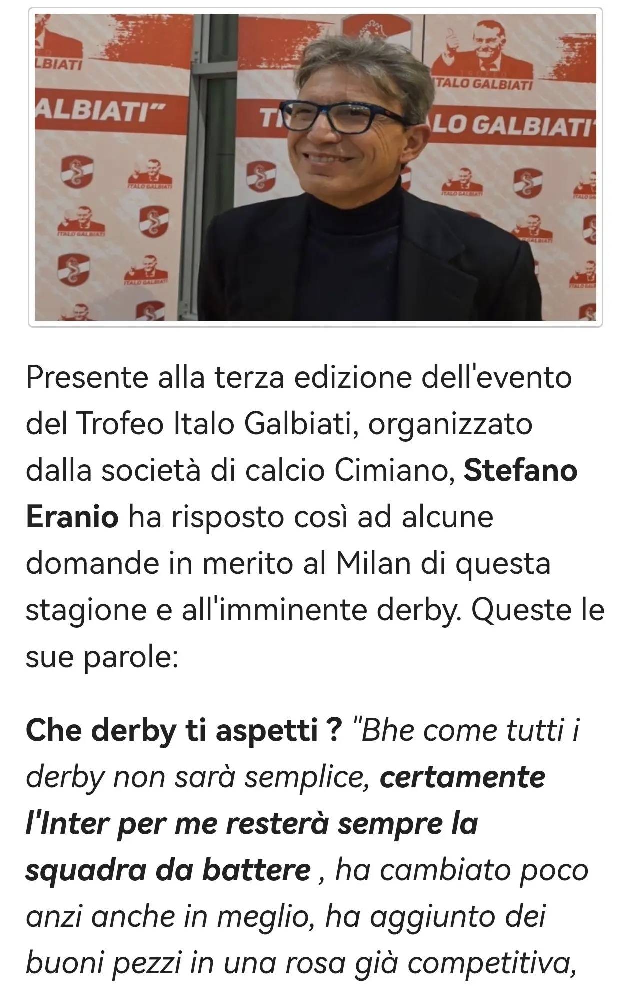 สเตฟาโน เอลาอิโน เข้าร่วมงานพิธีมอบรางวัล Italo Galbiati Trophy ครั้งที่สาม ซึ่งจัดโดยสโมสรฟุตบอล Cimmerio โดยเขาได้ให้สัมภาษณ์เกี่ยวกับผลงานของมิลานในฤดูกาลนี้และการแข่งขันดาร์บี้ที่กำลังจะมาถึง:
